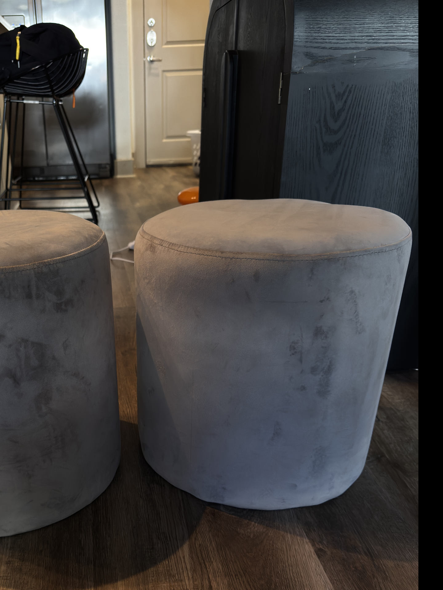 2 gray suede ottomans.