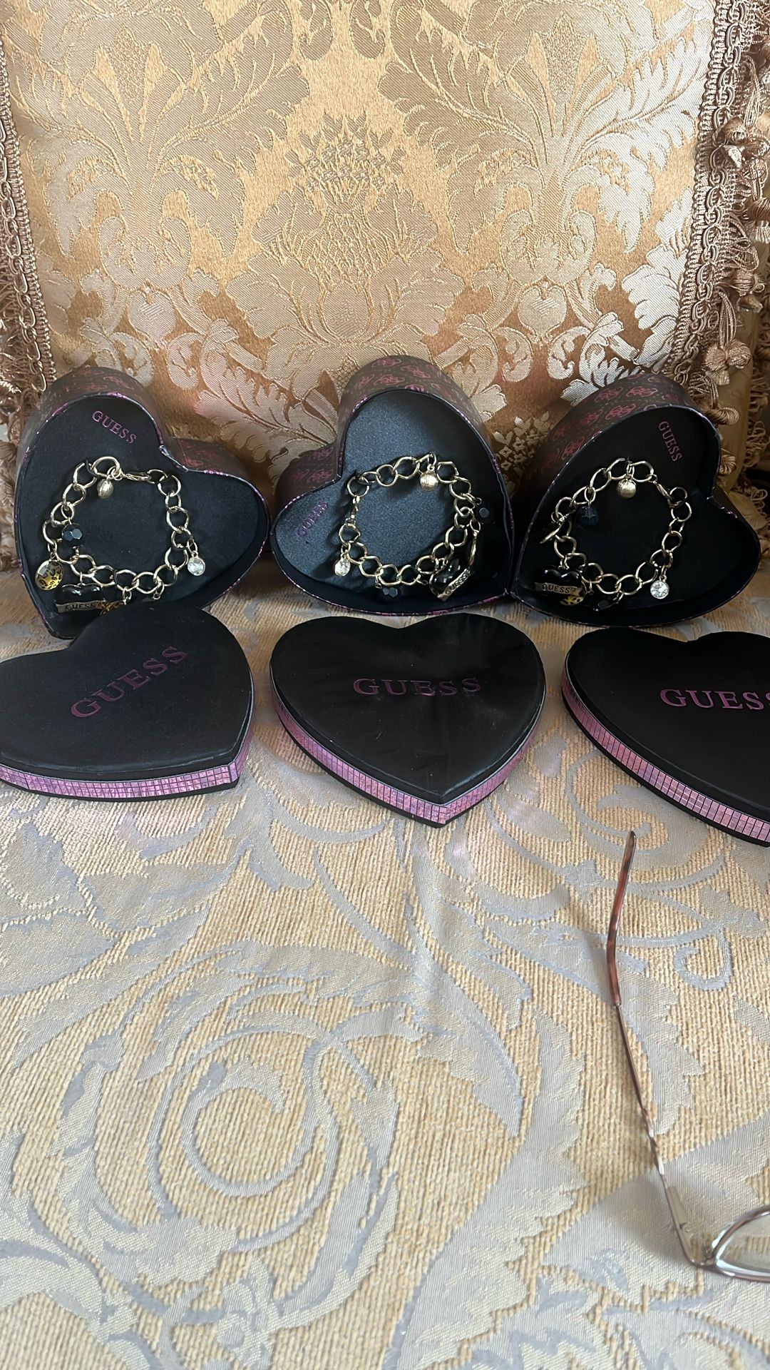 Brand new in a beautifully heart shape box, these women’s bracelets in a gold tone ideal for a perfect gift! Selling the 3 for $50.00