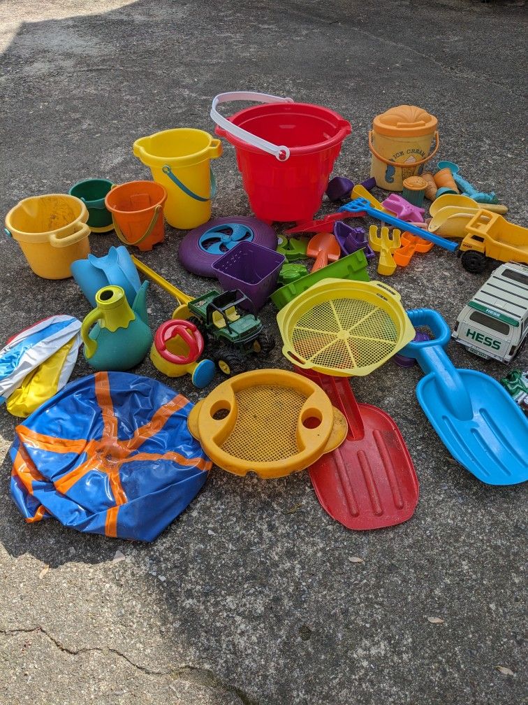 Beach Or Sandbox Toys. Big bag full of toys great for the beach or sandbox. Includes buckets, sand castle forms, ice cream set, balls, shovels, molds, and more! All for $10.