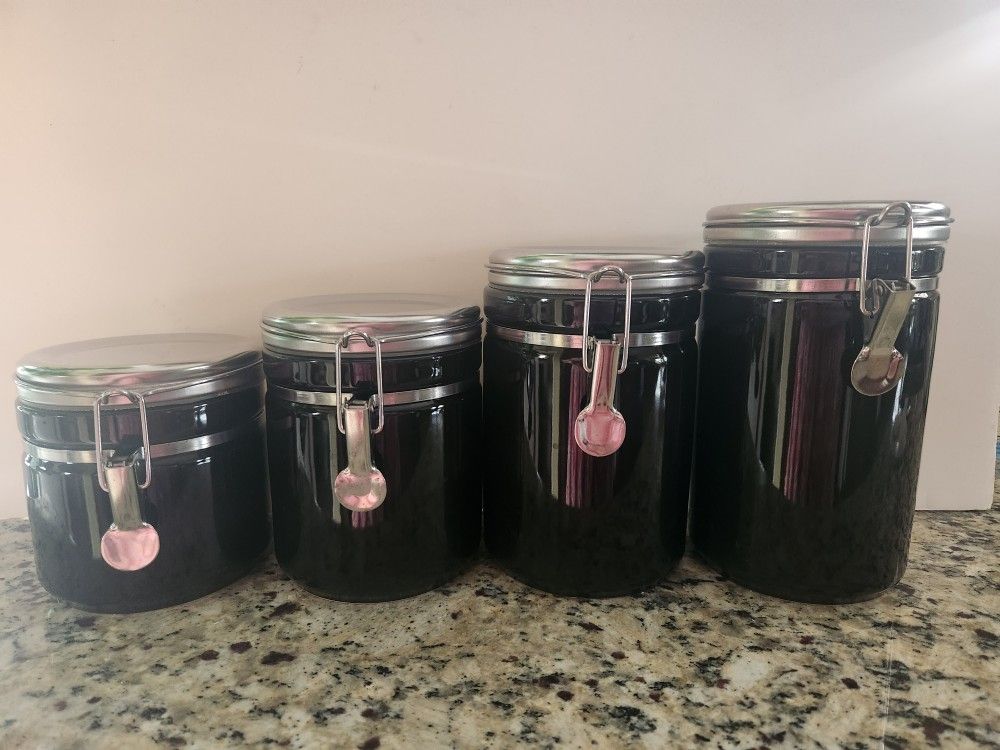 This 4pc ceramic Canister set is the perfect place to store your flour, rice, Coffee, sugar, cereal, etc. Stainless steel top Airtight clamp locks Canister Hand wash only Pre-owned, never used. Just taking space in my cabinet. All in excellent pre-owned conditions. Please see last few pictures for detail on couple of minor scratches on the lids from being stored in cabinet. Thanks for looking.