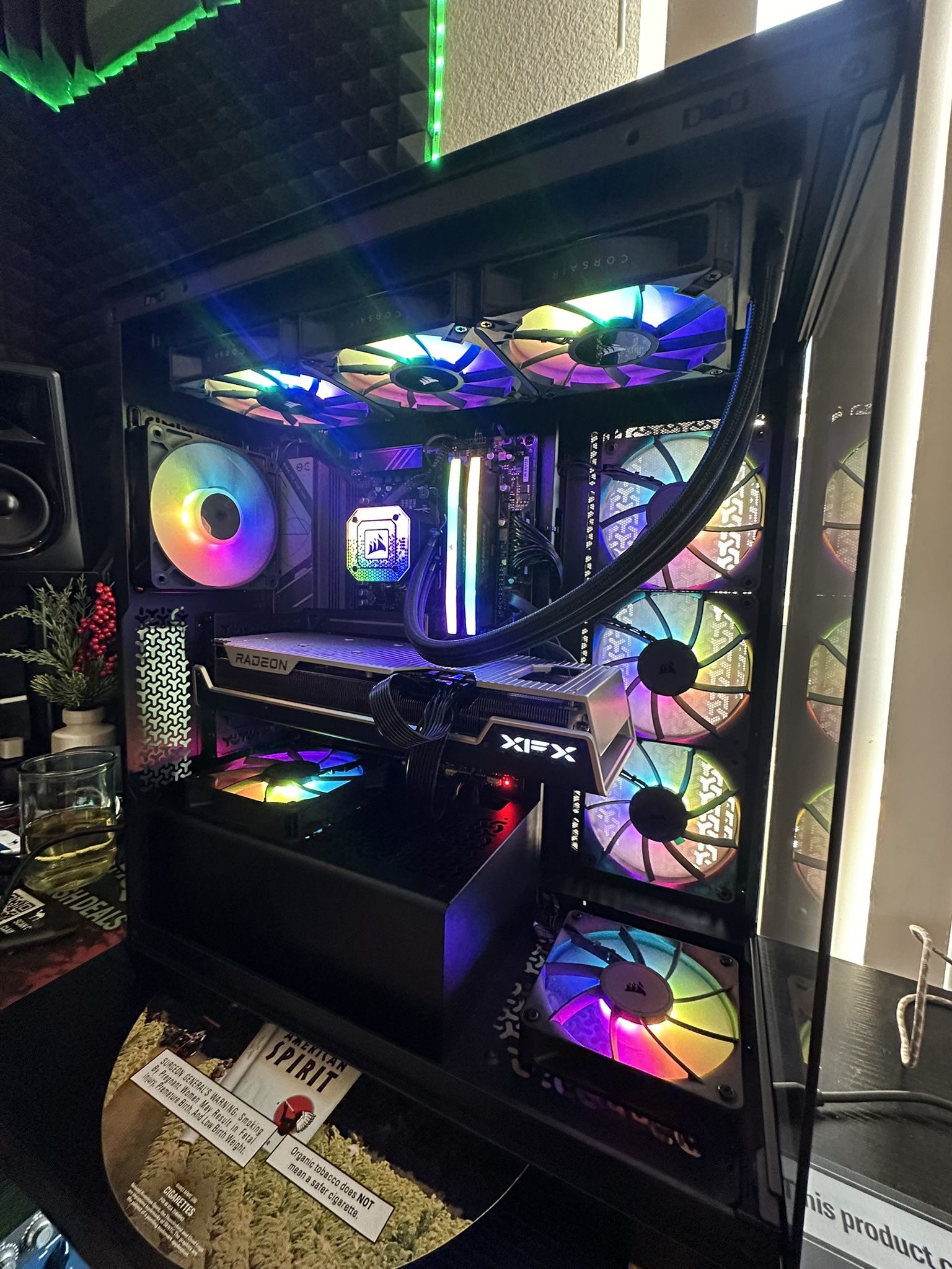 Selling an absolute beast of a PC. Amazing in Multicore performance for productivity aswell as 1440p Max Quality Gaming. Here is the breakdown of the components: CPU : AMD Ryzen 9 9900X 12-Core - 24-Thread 4.4 GHz (5.6 GHz Max Boost) Socket AM5 GPU: XFX AMD Radeon RX 7800 XT Gaming Overclocked Triple Fan 16GB GDDR6 PCIe 4.0 RAM: CORSAIR VENGEANCE RGB DDR5 RAM 32GB (2x16GB) 6000MHz CL30-36-36-76 1.40V AMD EXPO MOTHERBOARD: GIGABYTE B650 Eagle AX AM5 LGA 1718 AMD B650 ATX, DDR5 Triple M.2, PCIe 5.0, USB 3.2 Gen2x2 Type-C, AMD Wi-Fi 6E, Realtek GbE LAN Power Supply: Thermaltake Toughpower GF A3 850W, True 450W 12VHPWR Connectors on PSU & NVIDIA RTX 40 Series, ATX 3.0/PCI-E 5.0, 80+ Gold, SLI/Crossfire Ready Power Supply, PS-TPD-0850FNFAGU-L AIO: iCUE H150i ELITE CAPELLIX XT Liquid CPU Cooler SSD: Samsung - 990 EVO SSD 2TB Internal SSD PCle Gen 4x4 | Gen 5x2 M.2 2280, Speeds Up to 5,000MB/s Fans: CORSAIR - RS120 ARGB 120mm PWM Fans (3-pack) - Black Case: CORSAIR - 3500X ARGB ATX Mid-Tower PC Case - Black Open to offers, Lowballs will be ignored.
