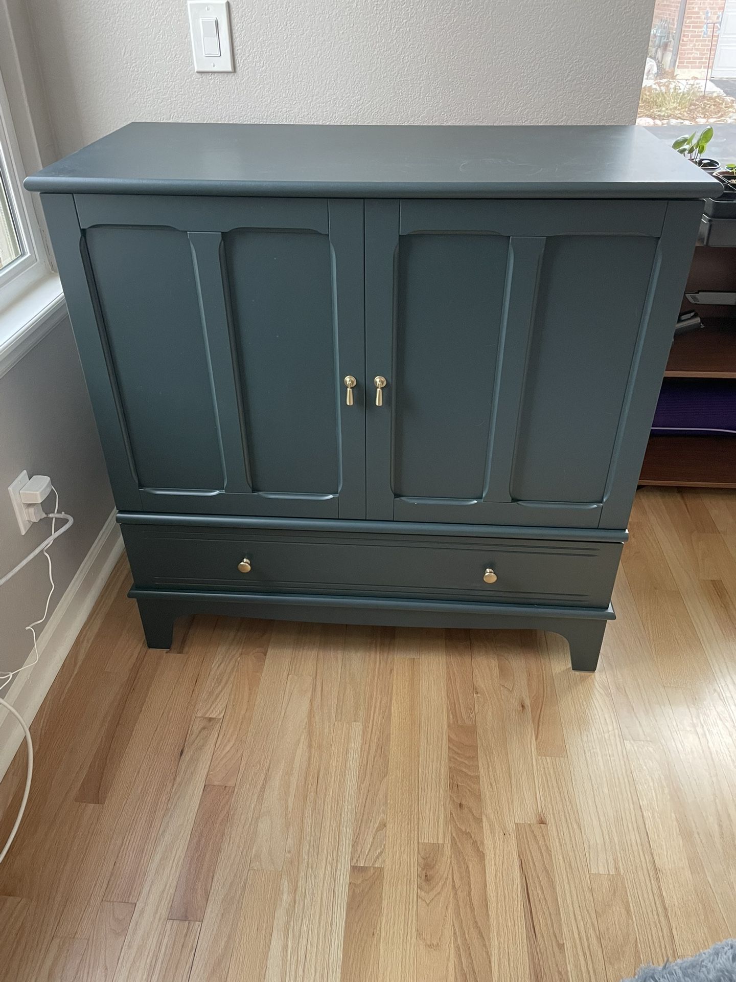 Two-door cabinet with a drawer and adjustable shelves in very good condition. The doors and drawer are soft close.