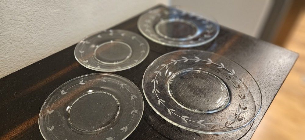 Anchor Hocking Glass Co. LAUREL pattern ( grey cut). Two luncheon plates (8") and two salad/dessert plates (6 1/4")