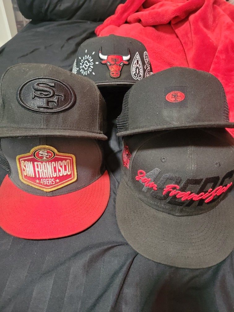 All hats are snap back except the bulls cap which is size 7 1/8. Needs a little tlc but still decent wearable condition. Great for consignment shops. Downtown San Jose area. Pick up only