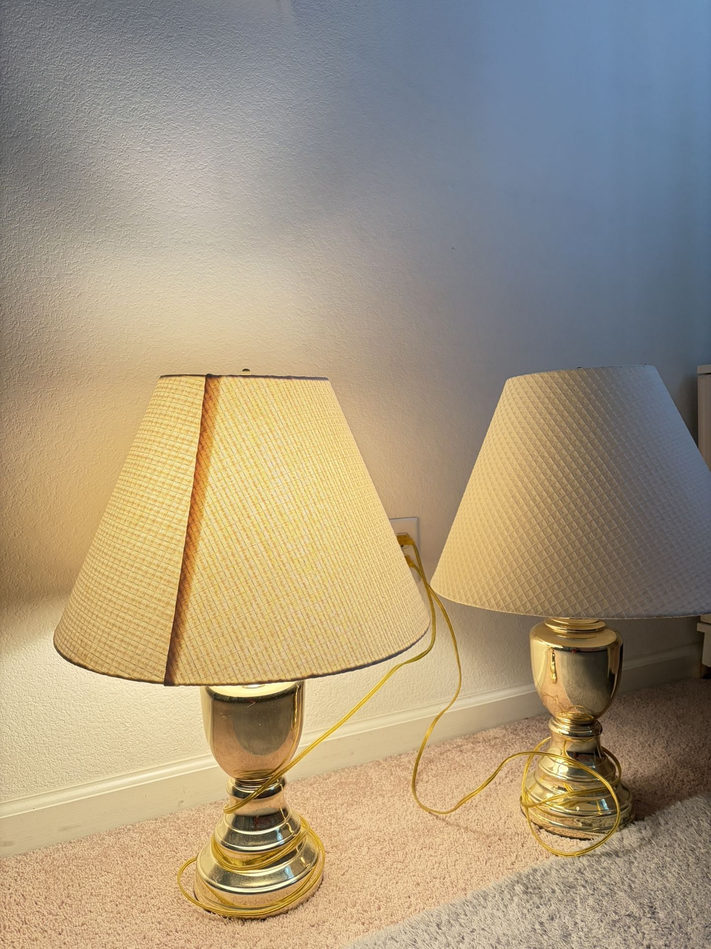 Set of 2 gold touch lamps. Touch the base to turn on/off and adjust brightness (low, medium, high). Fully functional and in great condition. Perfect for nightstands or side tables.