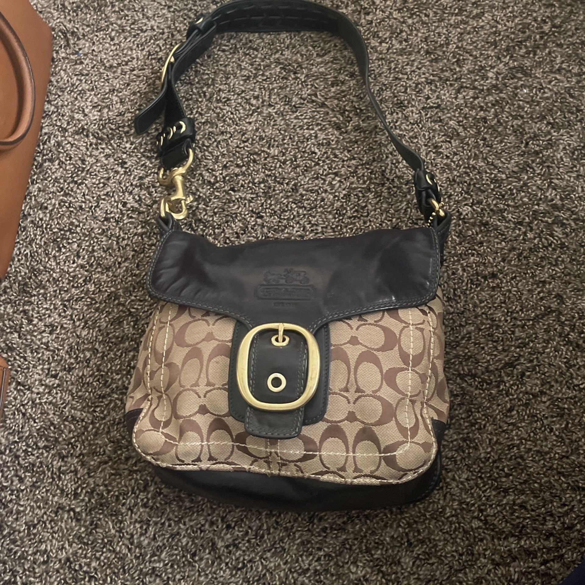 Coach Bleeker Legacy Black Leather Signature Tan Canvas Shoulder Bag Buckle