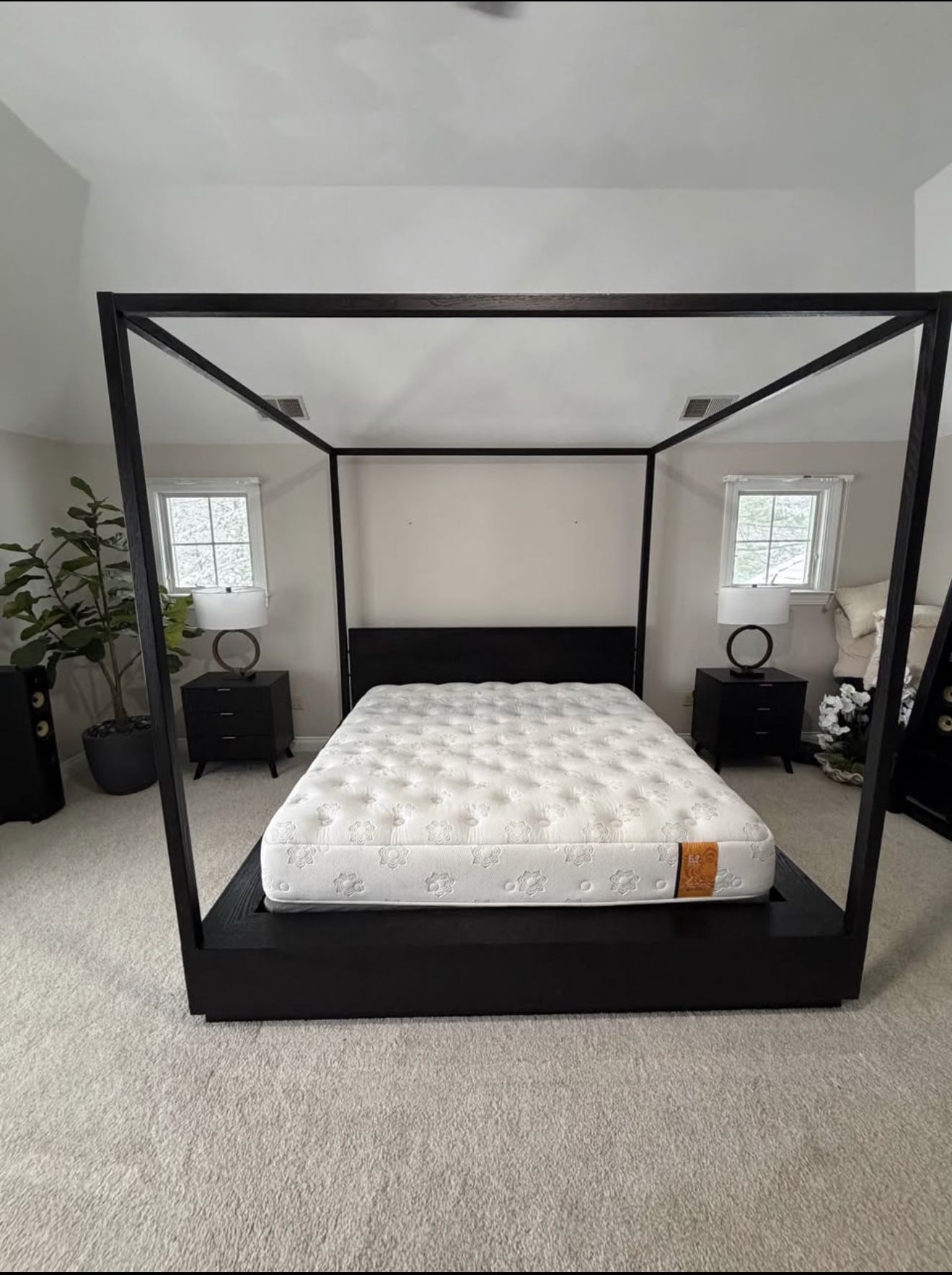 KING Size Restoration Hardware "MACHINTO" Canopy Bed Frame in Black Oak Wood MSRP: $7,395 Includes *PranaSleep Lotus Asana 6.2 Plush Mattress.* in Spectacular condition with an original retail price of *$4,499* 102" King Bed: 90"W x 89½"L x 102"H Headboard: 83¼"W x 40"H Floor to Top of Slats: 11½" Floor to Top of Mattress: 25½" (based on 14" mattress) Space for Adjustable Base: 77"W x 80½"L Weight: 524 lbs. Serious inquiries only, pickup only, Denham, MA Message for questions