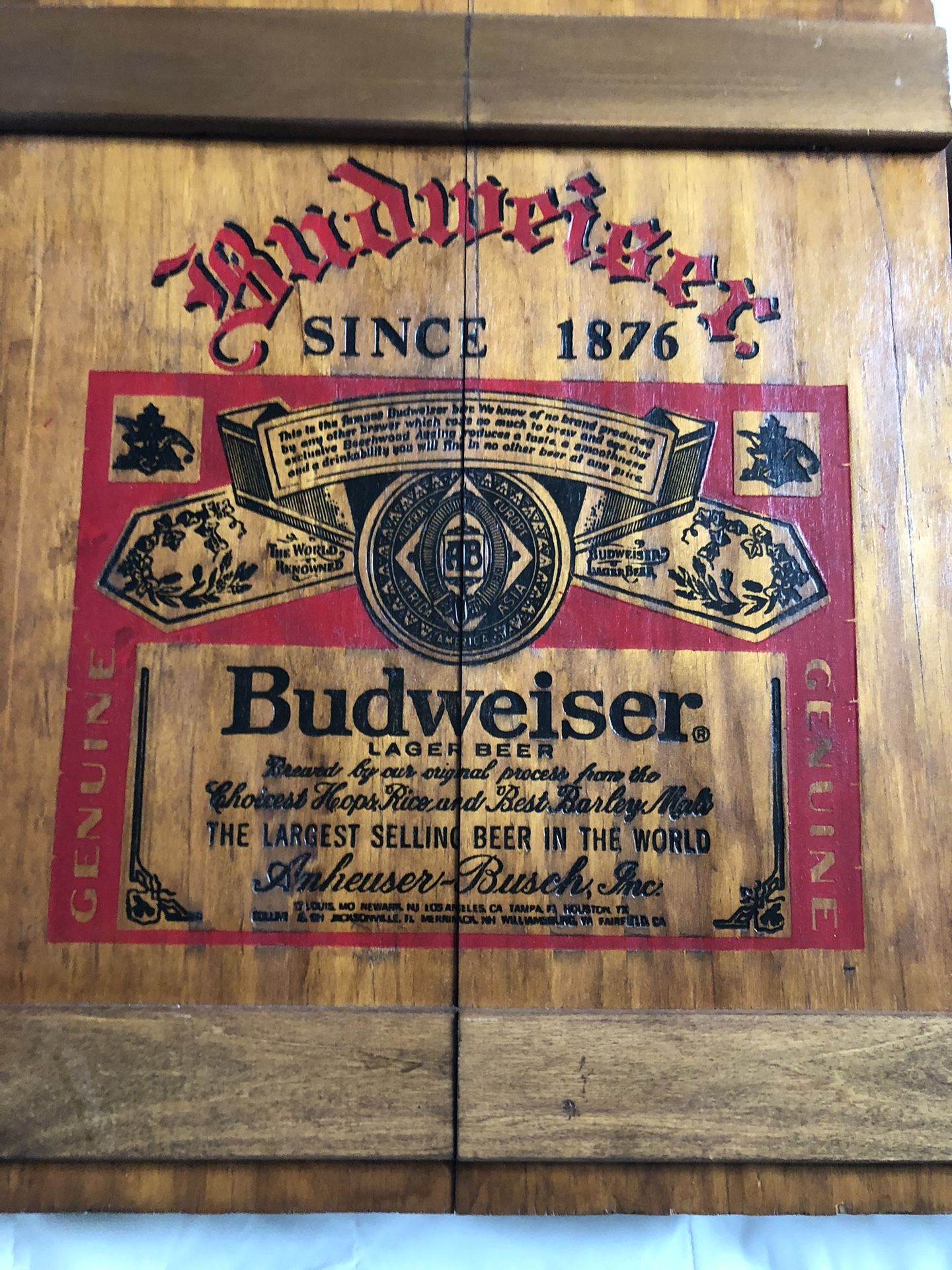 Vintage Budweiser wooden wall hanging storage cabinet. Cabinet has wall hangers attached and magnetic catch. Three inch depth. 18 and a half x 15 and a half.