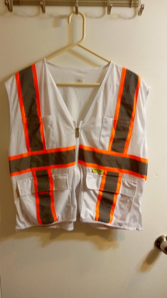 This is used has been worn about three times it's in good shape no ribs or tears the stripes are off fluorescent they shine the size is medium it is white with pockets in the front if interested inbox