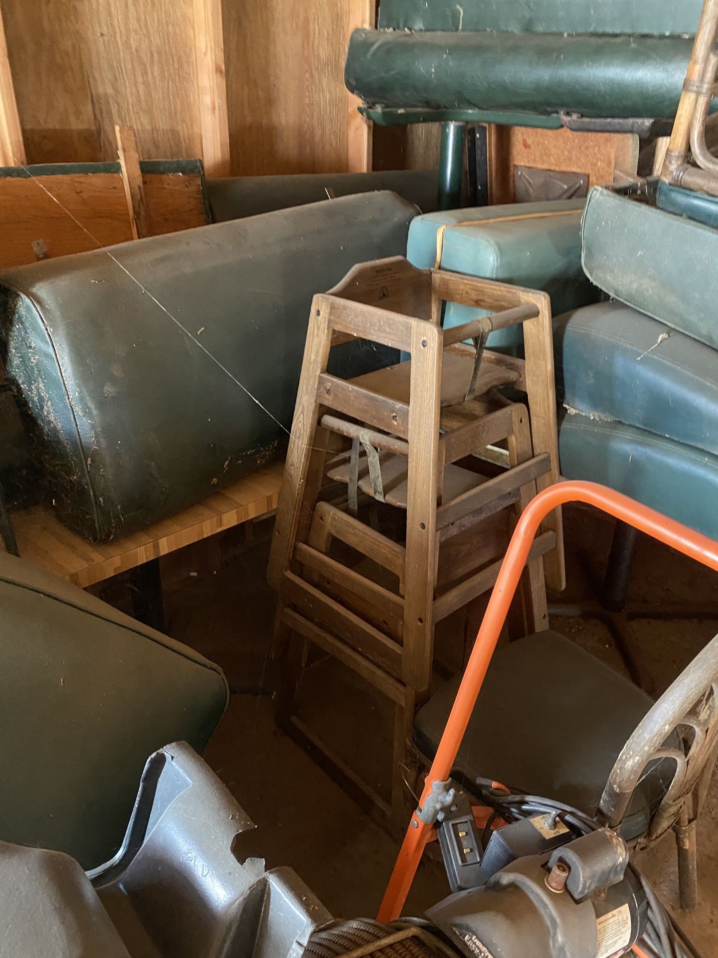 Everything dusty from storage. High chairs $15 each. There’s a couple more in another storage area. There might be 6 of them. There’s booths. Some need to be reupholstered. Not sure exactly how many there all. Some in very good condition. 42" standard height x 48" in length. Vinyl material. Booth prices depending on condition. Singles - $25-$75 Doubles - $125- $200 Giant 8 seater corner booth -$250-$350 Old wood chairs with vinyl seats - $10-$15 There’s about 30 chairs. 4x4 ft tables included in booth prices. And misc restaurant equipment. You’d have to come take a look and Make me an offer.