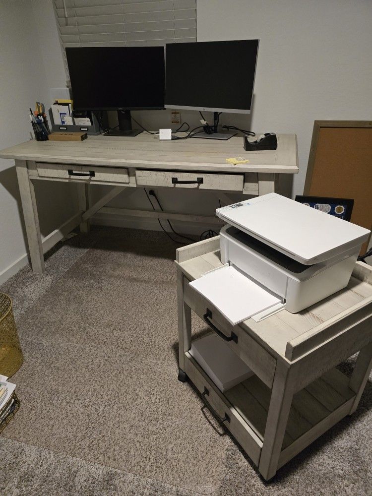 Home office desk, printer roller cart and storage shelves. Like new, used only for a year. Retails for over $700 new. All 3 pieces are in great condition!