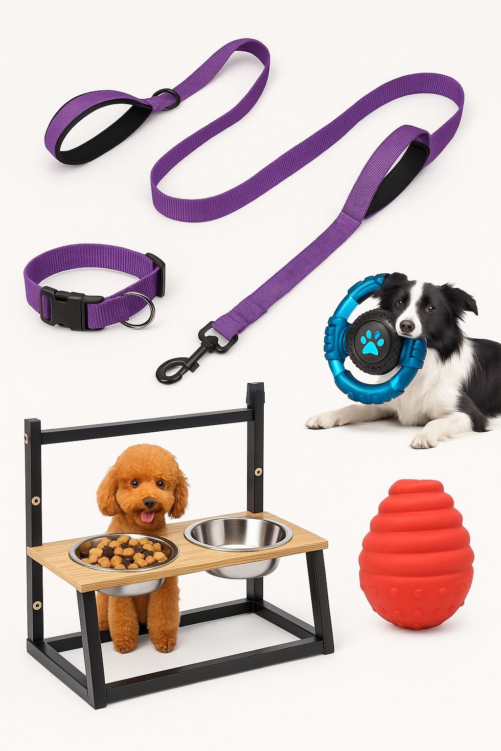 1 . Leash and collar set 2 . Chew Toys for Medium Large Breed 3 . Elevated Dog Bowl,5 Adjustable Height Raised Dog Bowl 4 . Dog Food Toy. Hi