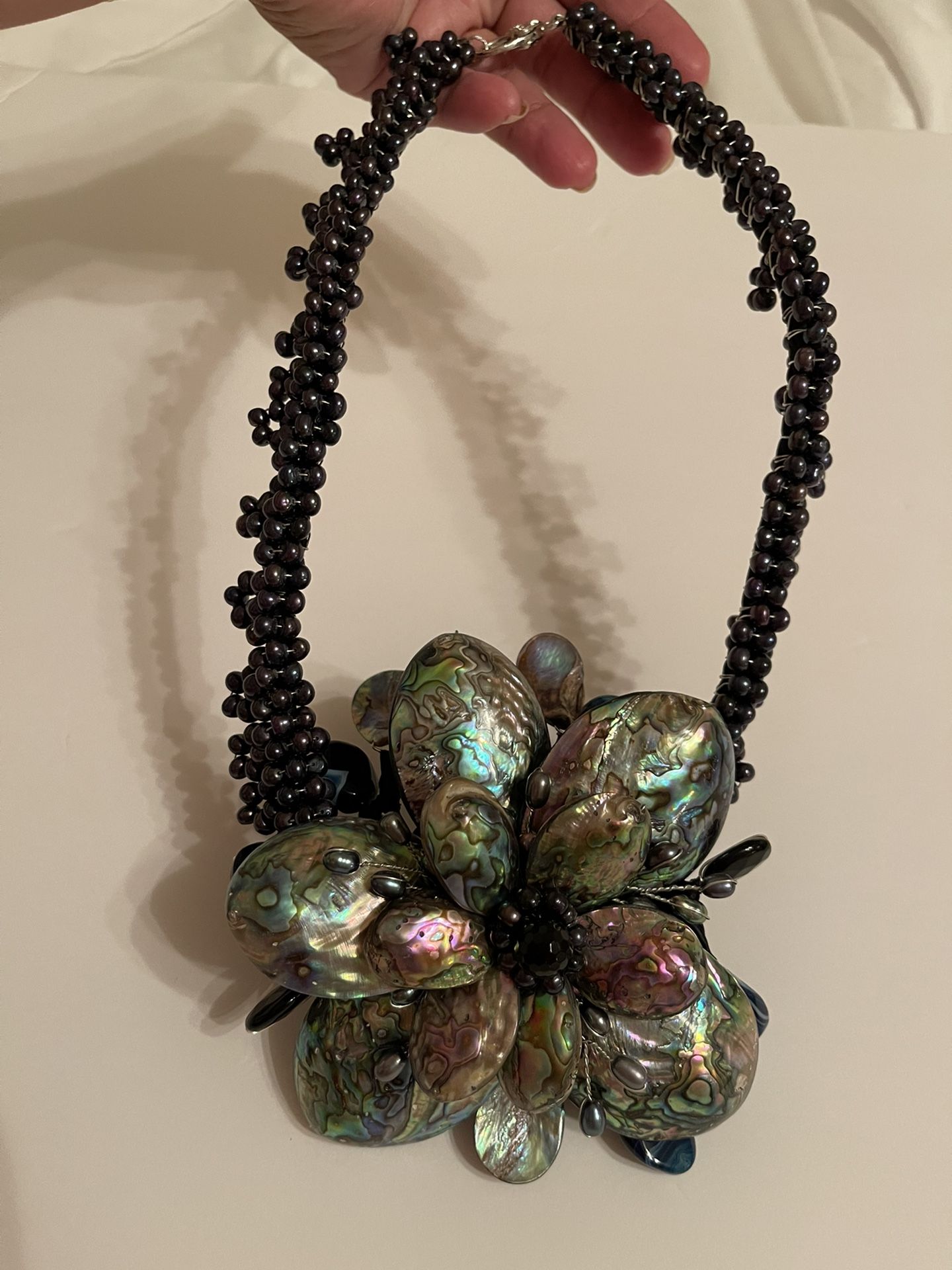 Abalone shell , black cultured pearl , onix and blue agate Hawaiian necklace 20 inches , brand new item , big flower pendant