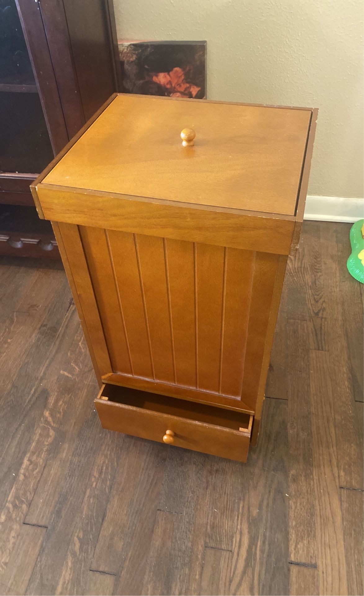 Wooden clothes hamper, has a drawer on the bottom and has wheels to roll it around.