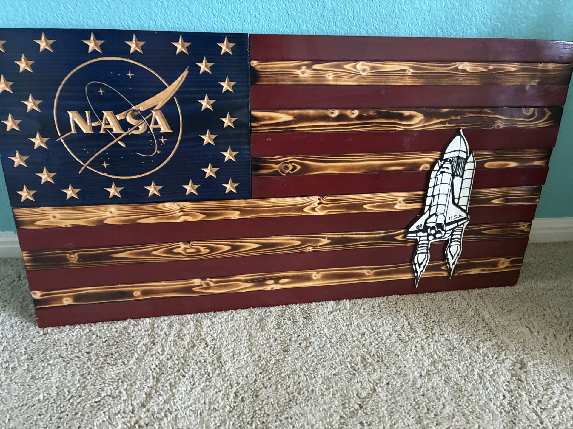 I have a beautiful United States Flag made from solid wood. It tributes NASA Space Shuttle. It s a Great Wall piece . 40 inches wide and 24 inches tall.