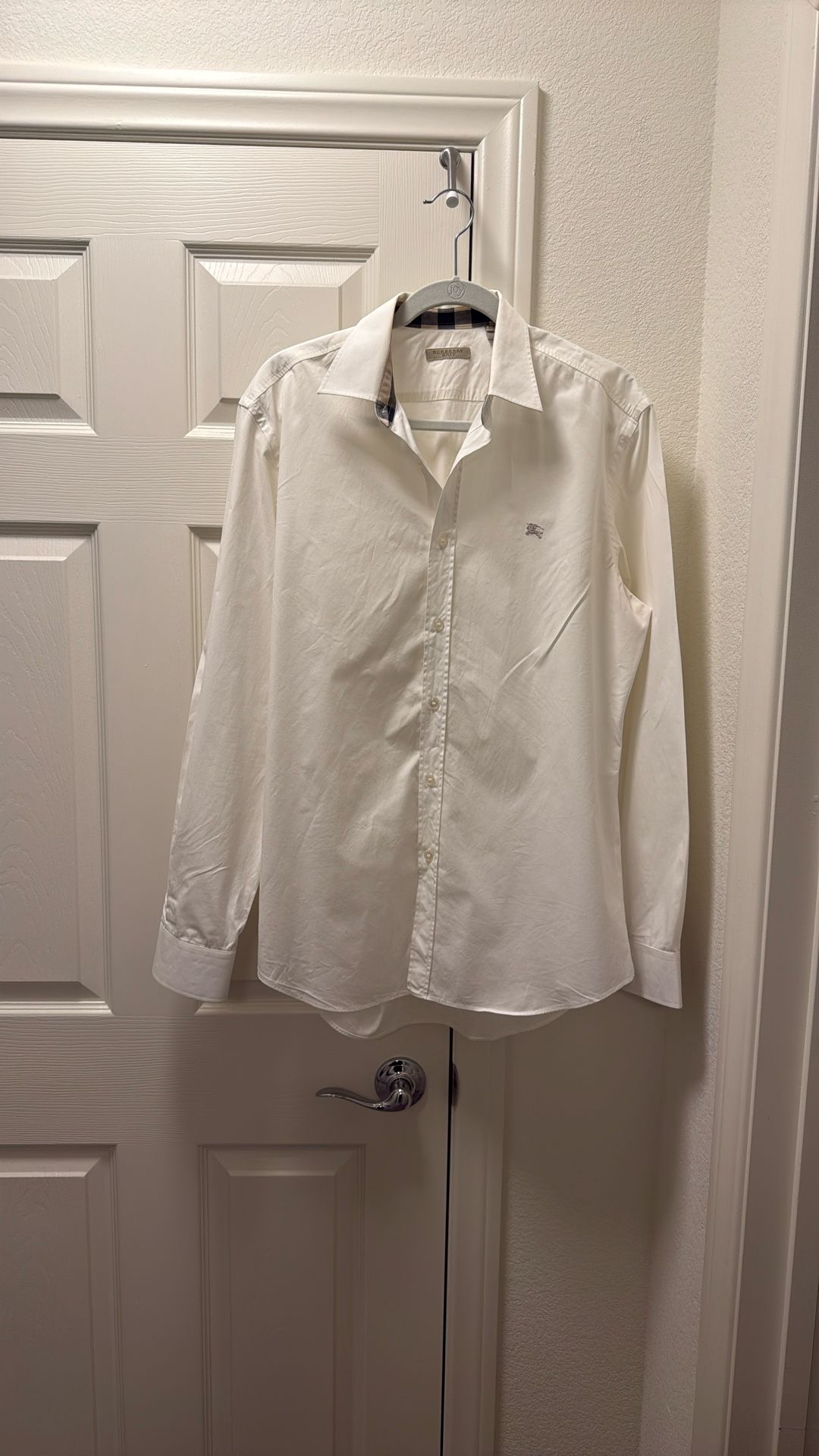 Selling a white collar, Burberry shirt. Classic blueberry checker on the inside of the collar and cuffs. Shirt has a little bit of discoloration around collar and under arm area. It is still in beautiful condition. 100% authentic, purchased at Saks Fifth Avenue. Comes from a pet free and smoke free home Asking only $ 50