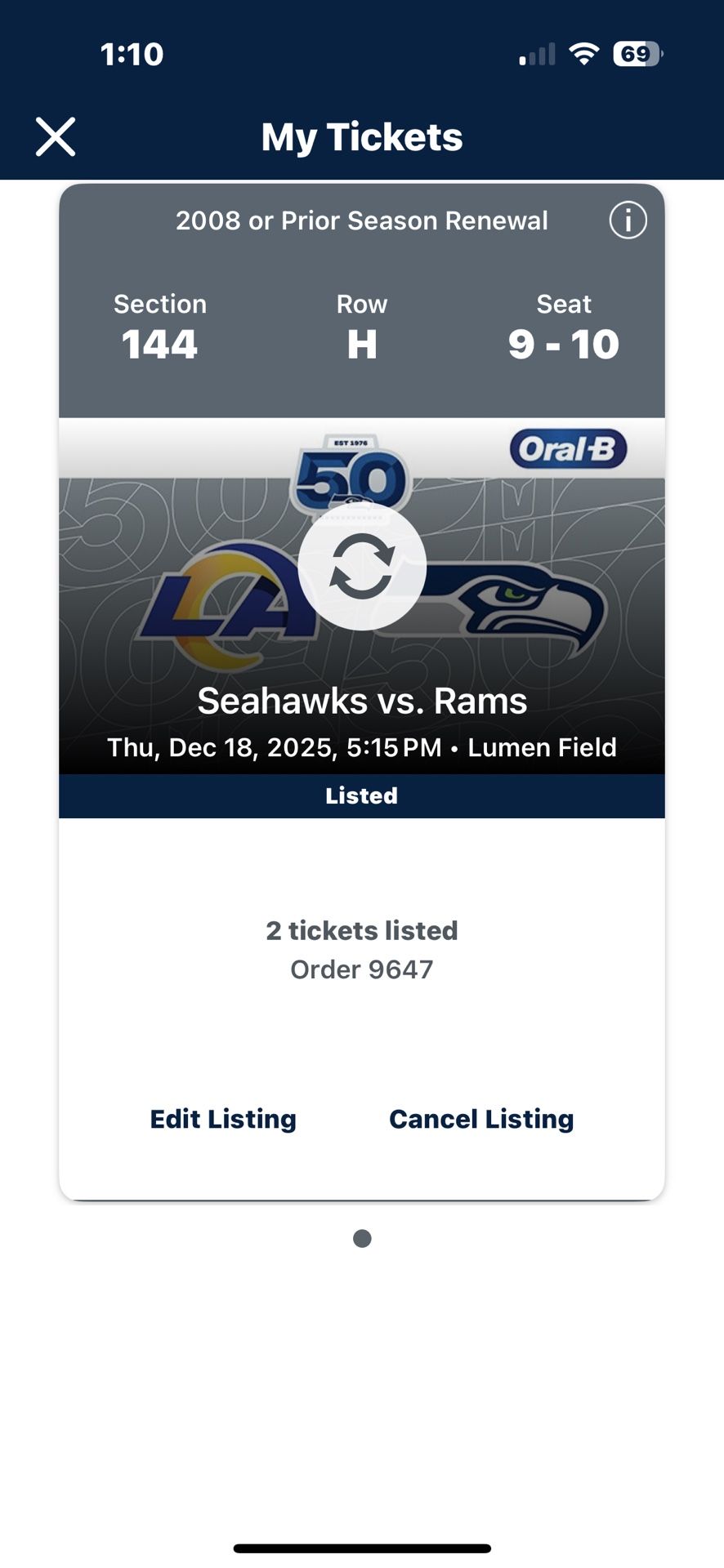 2 Seahawk Tickets vs LA RAMS Sec 144 H Seats 9-10