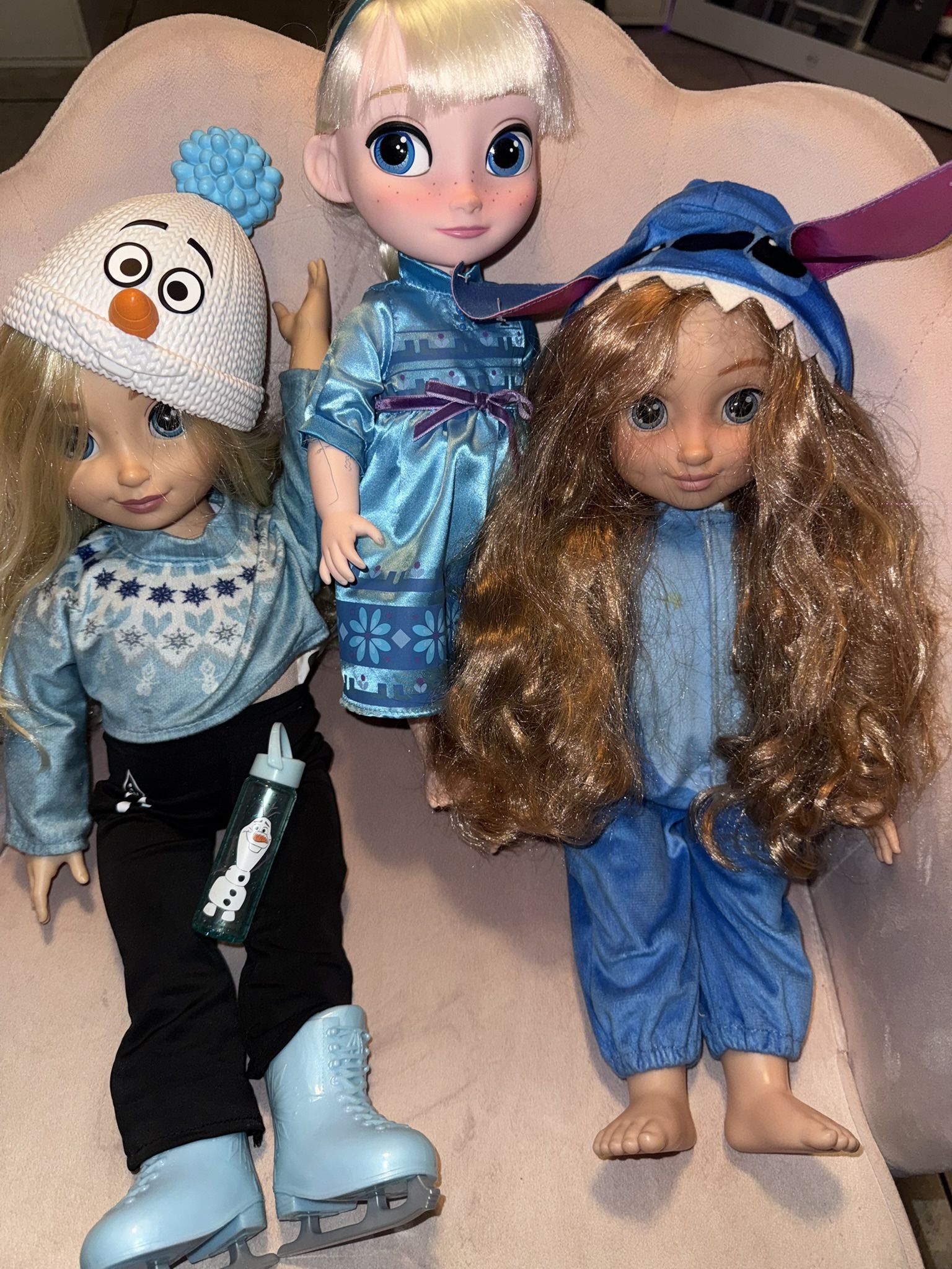 Selling an adorable set of 3 Disney ILY 4ever dolls! One Elsa doll is rocking a blue sweater, black pants, and ice skates - and she's got an Olaf beanie on her head! Comes with a mini Olaf water bottle too. Another Elsa doll is wearing a gorgeous blue dress, and the third doll is all about Stitch in a blue onesie.