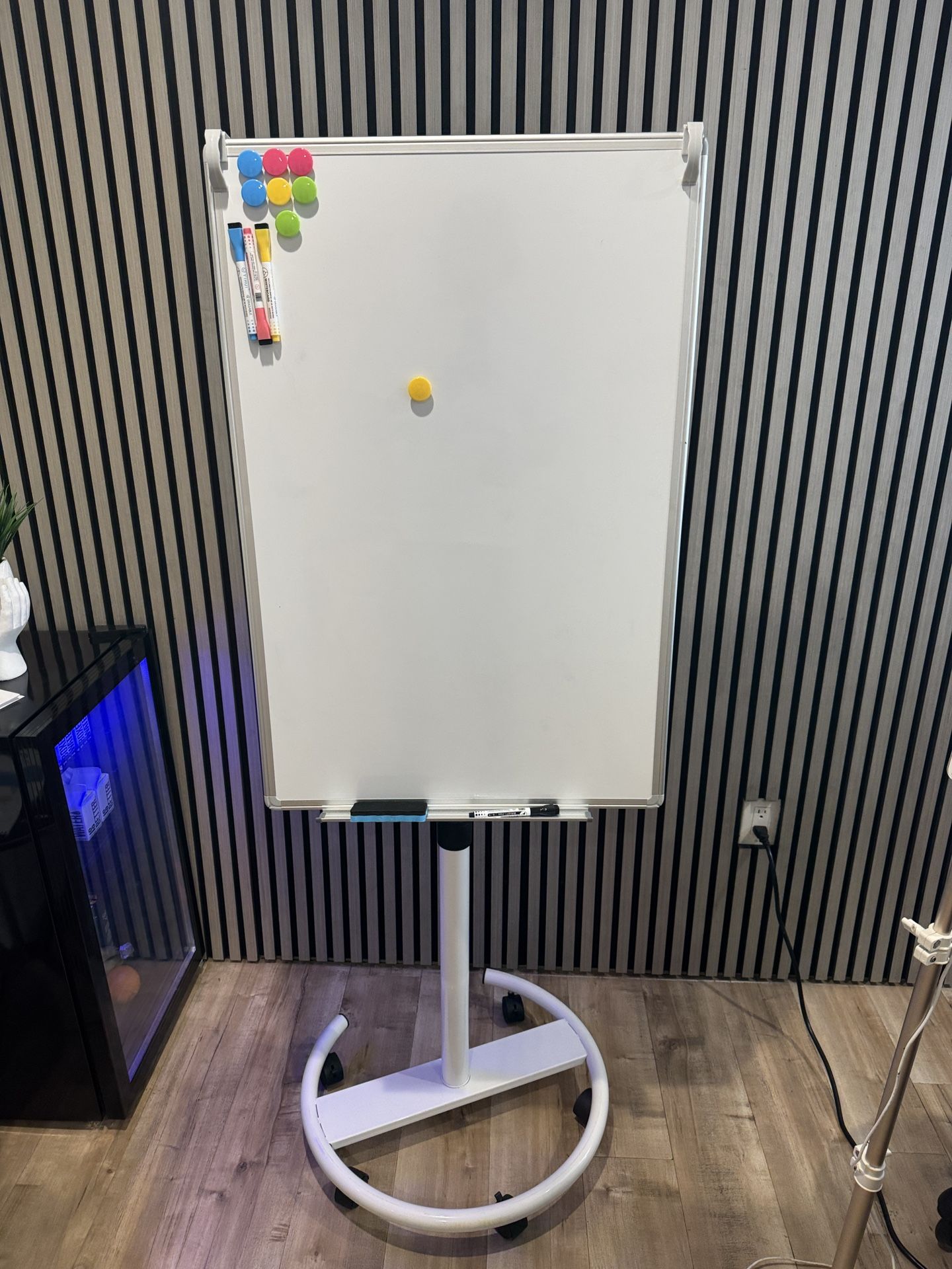 Portable dry erase whiteboard on a rolling stand. Magnetic surface (use magnets), writes and erases clean. Sturdy base with caster wheels, easy to move around. Great for office, tutoring, homeschooling, meetings, or planning. Approx board size: about 25” wide x 35” tall.