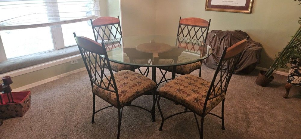 Round glass top table, wooden and metal base. 4 matching chairs with metal frame and matching wooden accent. The seats have pineapple print. All chair seat cushions are in perfect condition without any tears.
