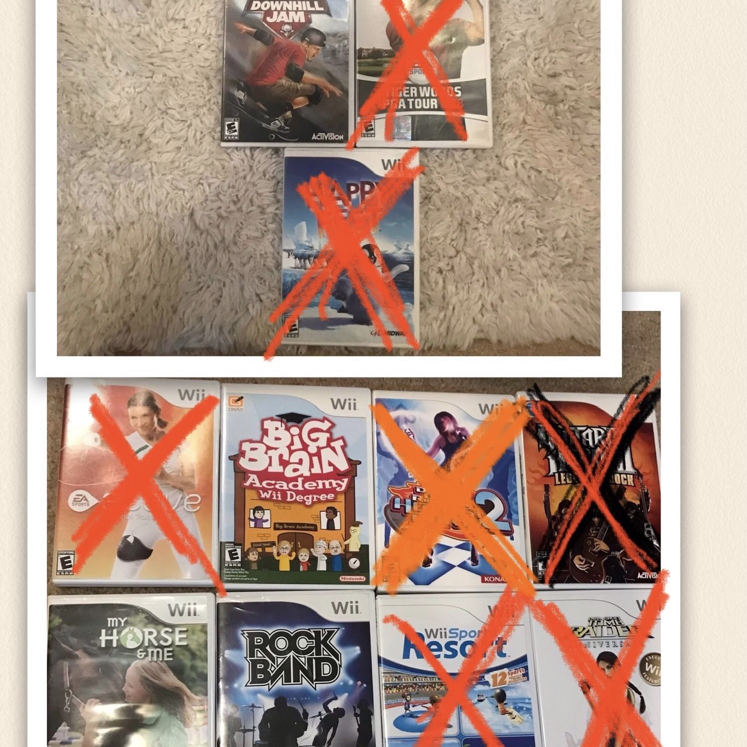 All in great condition. Cases are free of chips or cracks. Will sell for $10 each. Listing price is for all. Big Brain Academy Wii Degree: manual and pamphlets included. Rated E. Nintendo. My Horse & Me: scrape in plastic on back. See photo. Rated E. Atari Rock Band: manual included. Rated Teen. MTV Games & EA Dewey’s Adventure Balls of Fury LEGO Lord of the Rings