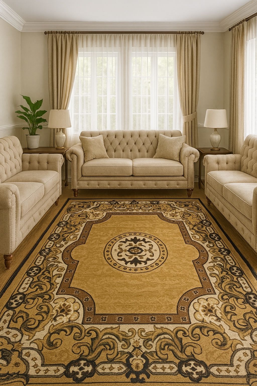 Classic 8x10 area rug in brown, gold, and beige with ornate medallion and floral border. Traditional design perfect for elegant living rooms or formal spaces.