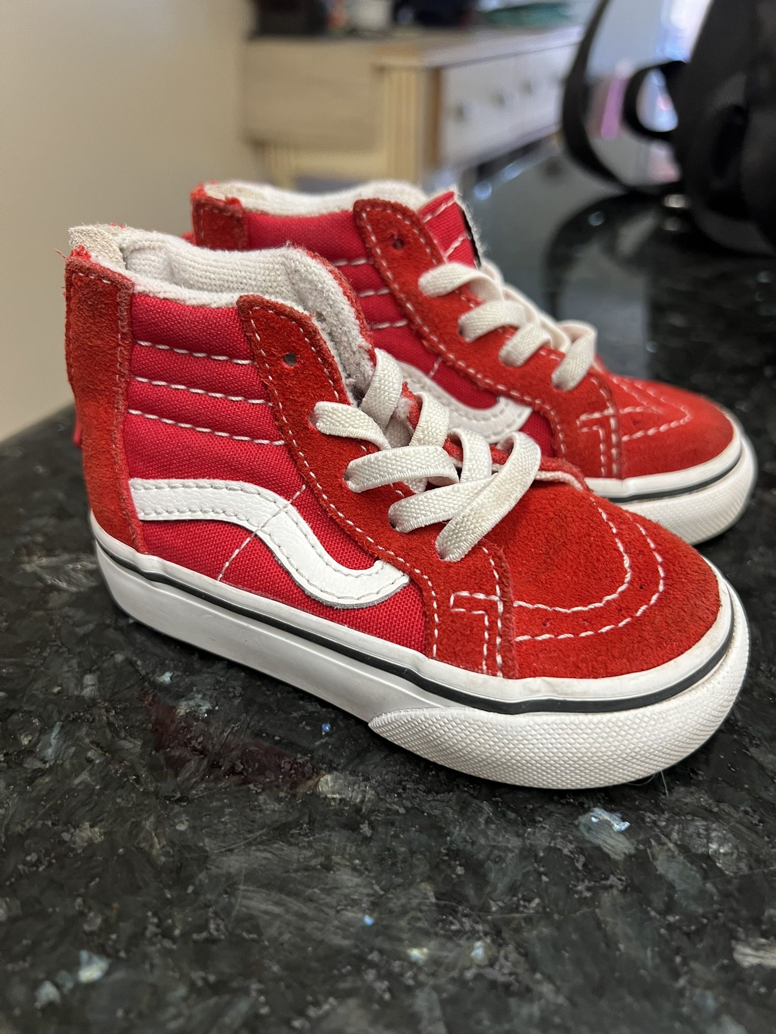 2 pairs of red high top vans size 4.5 & 5 2 pairs of black vans size 5 Rain boots size 5 White boots size 5 Princess heels size 6 but fits a 5 Toddler slippers/sandals 4,5&6 Crocs size 5 11 pairs from the picture but will add more shoes that are not in the picture. Most size 5