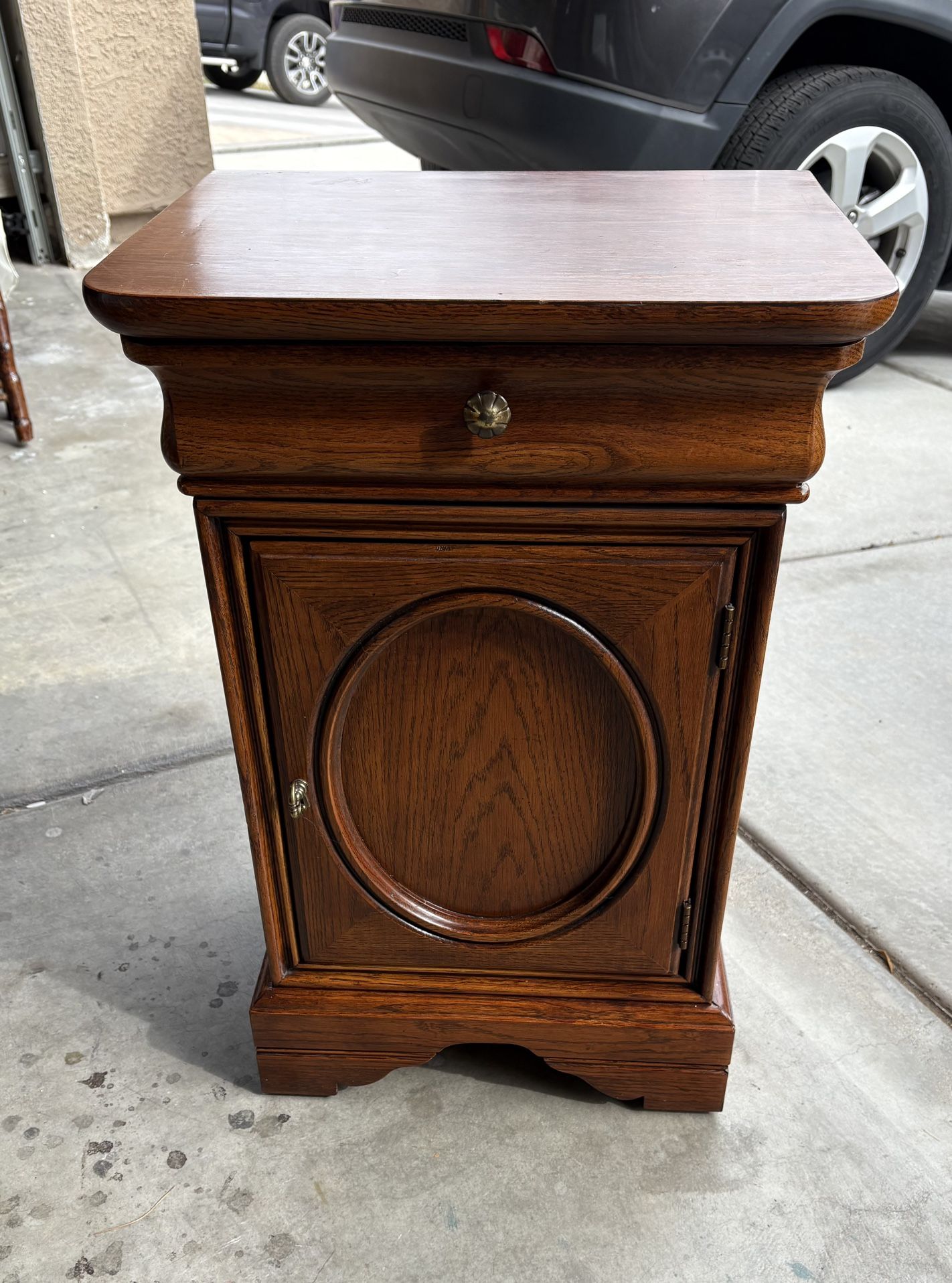 I nightstand by Lexington furniture chez Michelle. Cherry finish by DREXXL. 2 ft 3 inches tall and 1ft 2 inches front to back. And 6 inches across