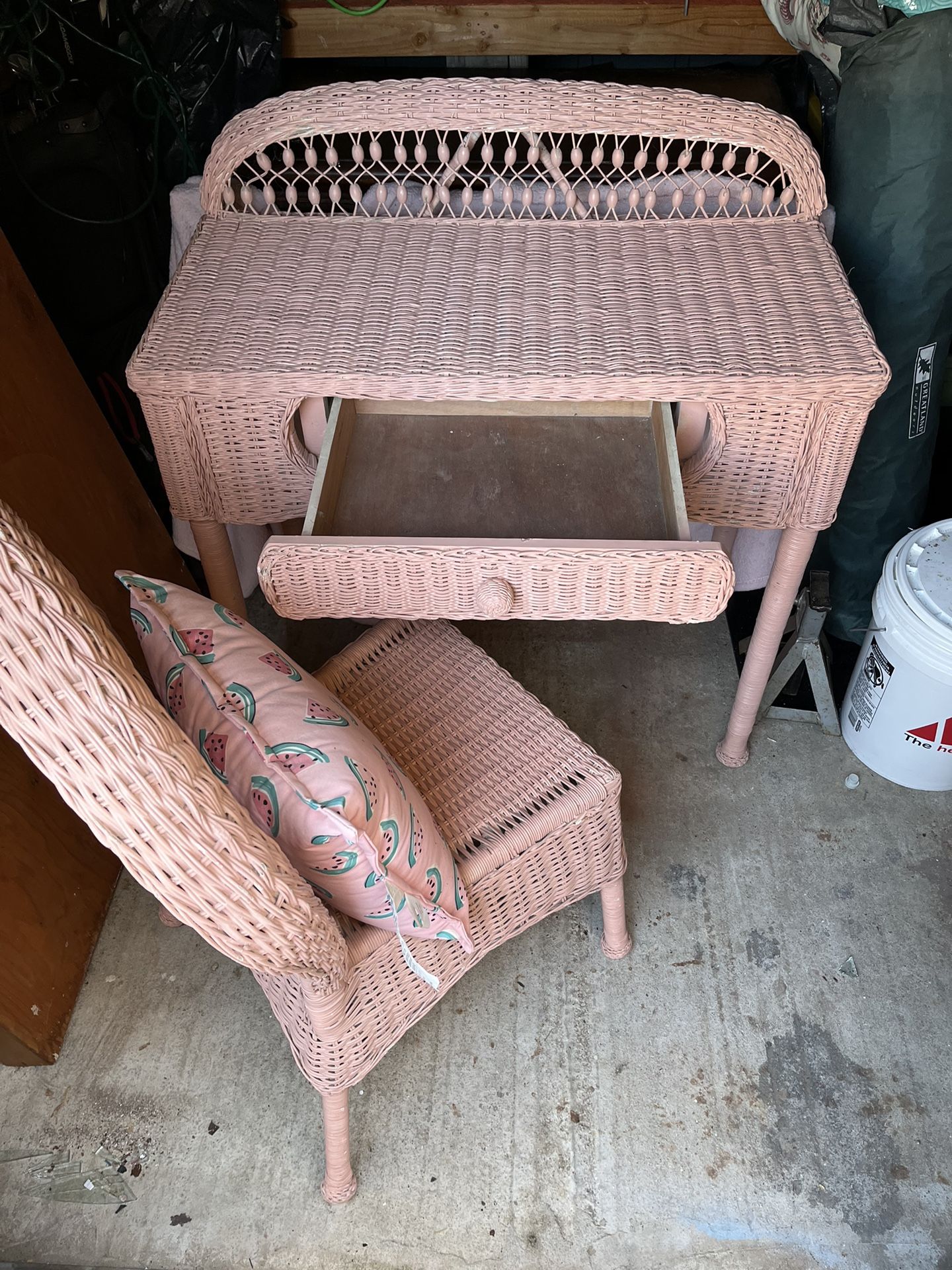 Coral pink wicker desk and chair