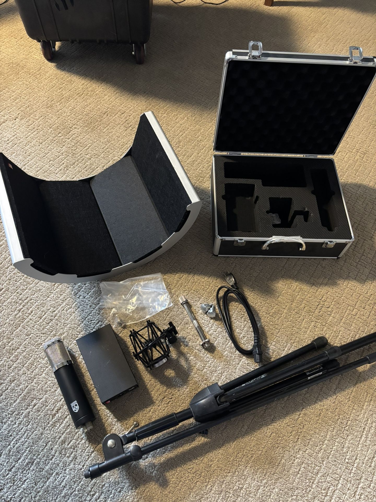 This is completely brand new. All of it except the tripod. I built a studio that I never got to fully finish and have some really good equipment here. This is a $700 microphone but I have that and more with the case and sound wall and tripod that I’ll do for $600 or best offer. This is a very very HQ mic with power supply and all cables. First come first serve!