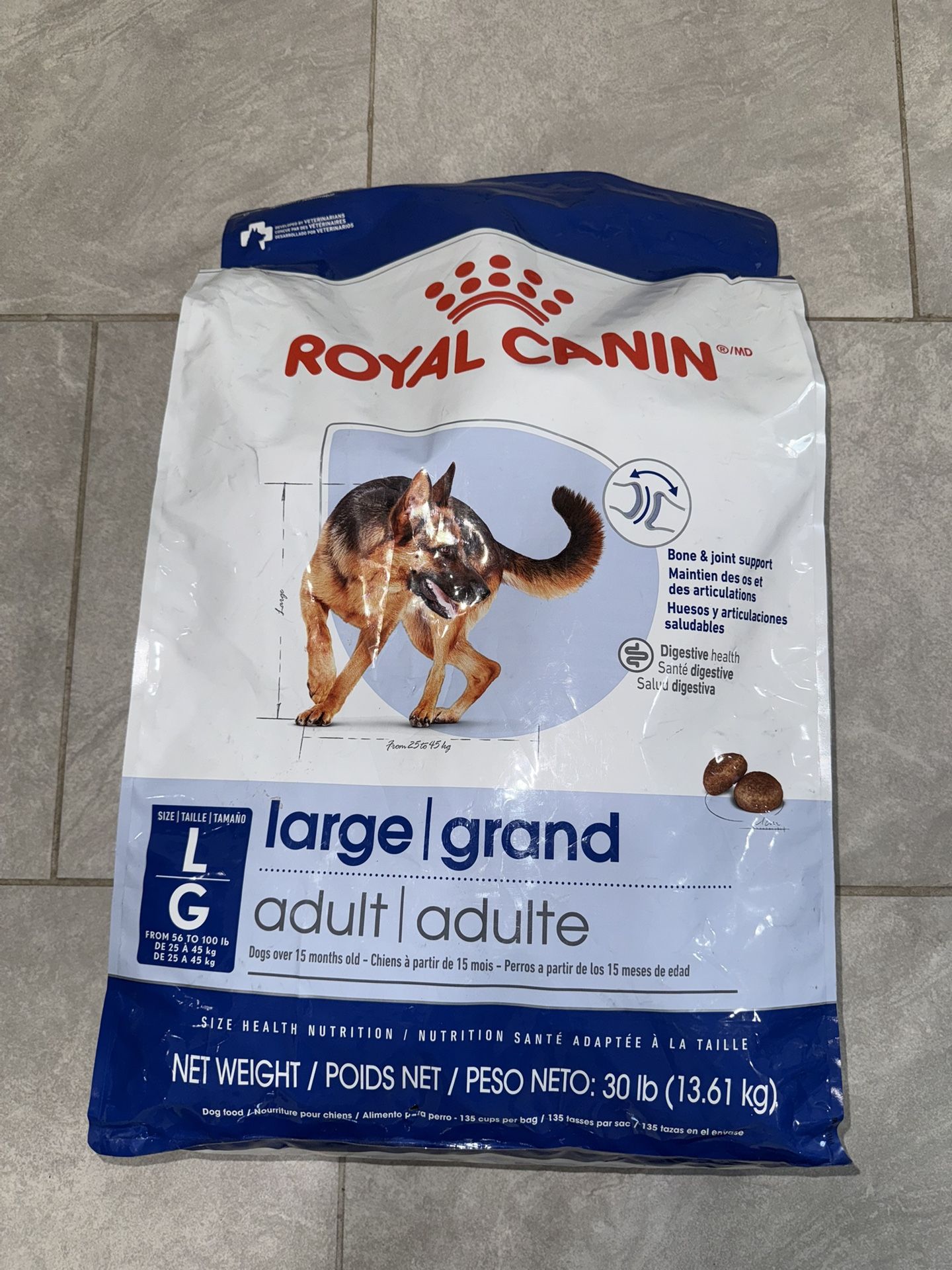 Serve up the tailored nutrition your large-sized dog deserves with Royal Canin Size Health Nutrition Large Adult Dry Dog Food. This complete and balanced high-protein diet provides the nutrients your larger dog needs in a crunchy kibble texture they'll love. Royal Canin Large Adult Dry Dog Food helps support your dog's bone and joint health with a combination of high-quality minerals and nutrients, while easy-to-digest, high-quality proteins, plus fibers and prebiotics, help promote optimal stool quality. This formula also includes clinically proven antioxidants, vitamins C & E, and prebiotics for a healthy gut and immune system. Plus, the exclusive kibble dog food is highly palatable and will keep them coming back to their bowl for every meal. Health is something different for every pet. Give your dog carefully selected ingredients that align with their life stage, size, and activity level and take comfort in knowing their food was designed with them in mind. - LARGE BREED DOG FOOD: Royal Canin Large Breed Dry Dog Food for dogs weighing 56 to 100 lbs - BONE & JOINT SUPPORT: A combination of minerals and nutrients to support the extra demands on a large dog's bones and joints - PRECISE NUTRITION: Easy-to-digest, high-quality proteins, plus fibers and prebiotics to promote optimal stool quality - HEALTHY IMMUNE SYSTEM: Clinically proven antioxidants (vitamins C & E) and prebiotics for a healthy gut to help maintain a healthy immune system - MIXED FEEDING: Crunchy kibble dog food texture pairs well with Royal Canin wet dog food for added palatability and hydration - QUALITY AND SAFETY: Attention to the very smallest details during the formulation and production process helps Royal Canin deliver precise and effective health nutrition for pets - TAILORED NUTRITION: Check out the full range of Royal Canin wet and dry dog food formulas that offer precise nutrition for dogs of all ages, sizes and breeds