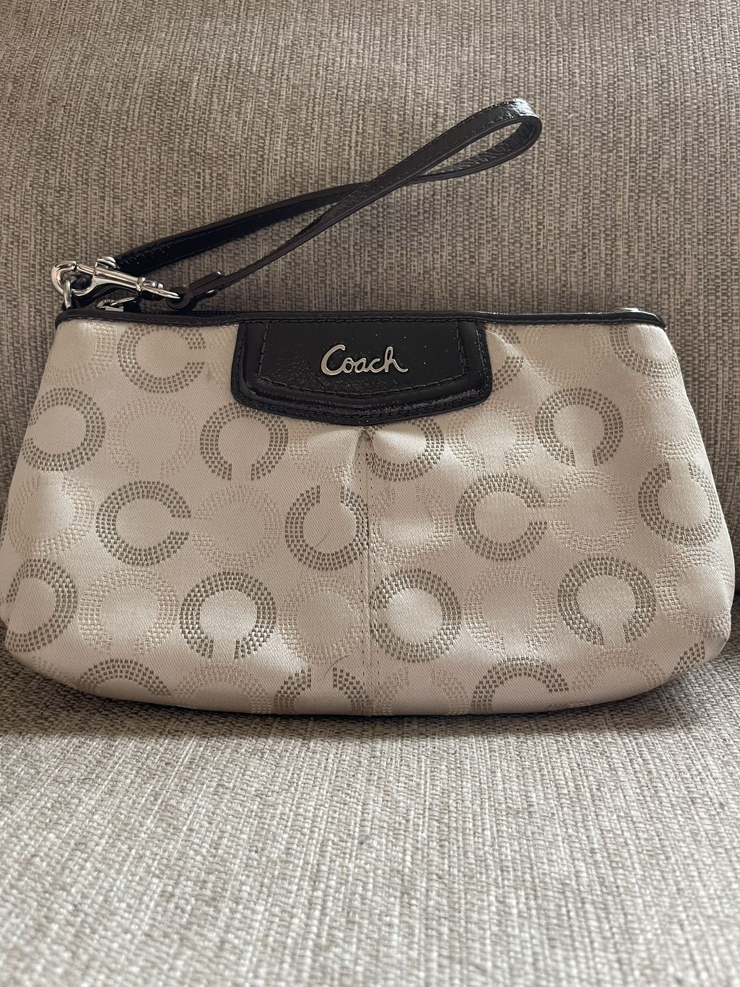 Cream and brown Wrist handle is in excellent shape Minimal wear on the interior One stain on exterior (photo) 9.5 wide x 5.5 tall