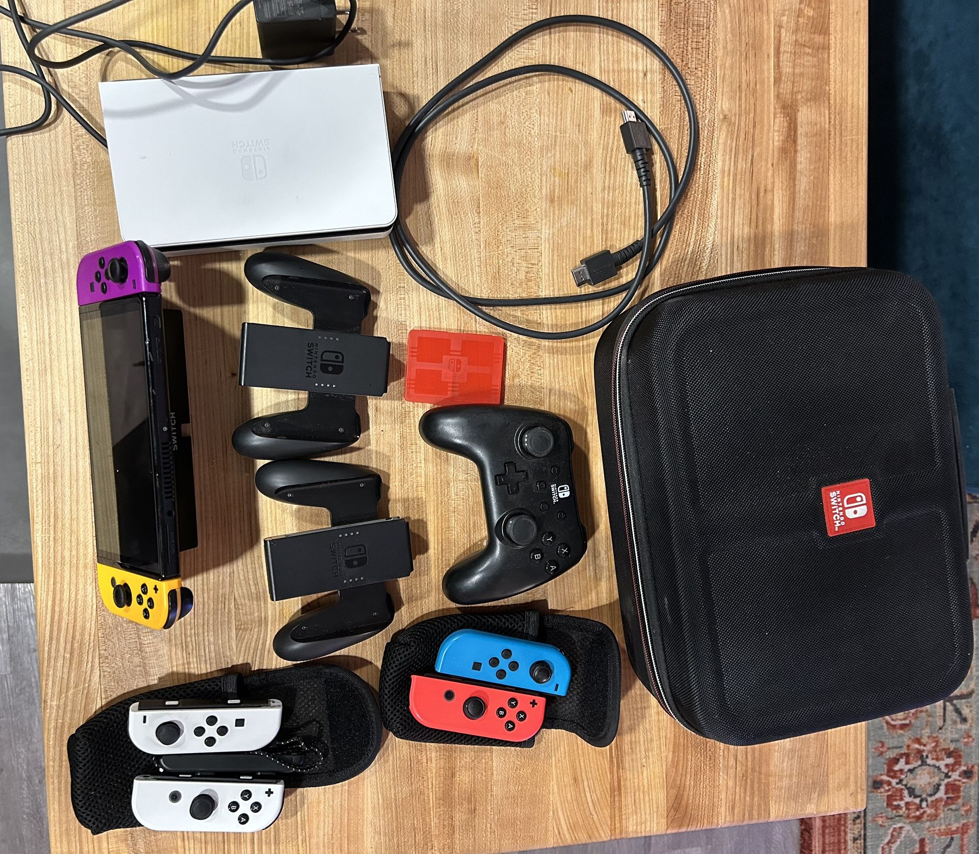 Nintendo Switch OLED with 256 GB micro SD, 3 sets of joycon controllers (all white, blue & red, orange & purple) plus wireless comfort grips, docking station, hdmi and power chord, plus a travel/carrying case. I had a screen protector so the screen is very well preserved/no damage. The joycon controllers have normal wear and tear, but all work. I also have an extra controller for TV playing that’s missing the chord, but it’s easily replaceable. Nothing wrong with the system, my husband bought a Nintendo Switch 2 and we didn’t want this old system to go to waste. i