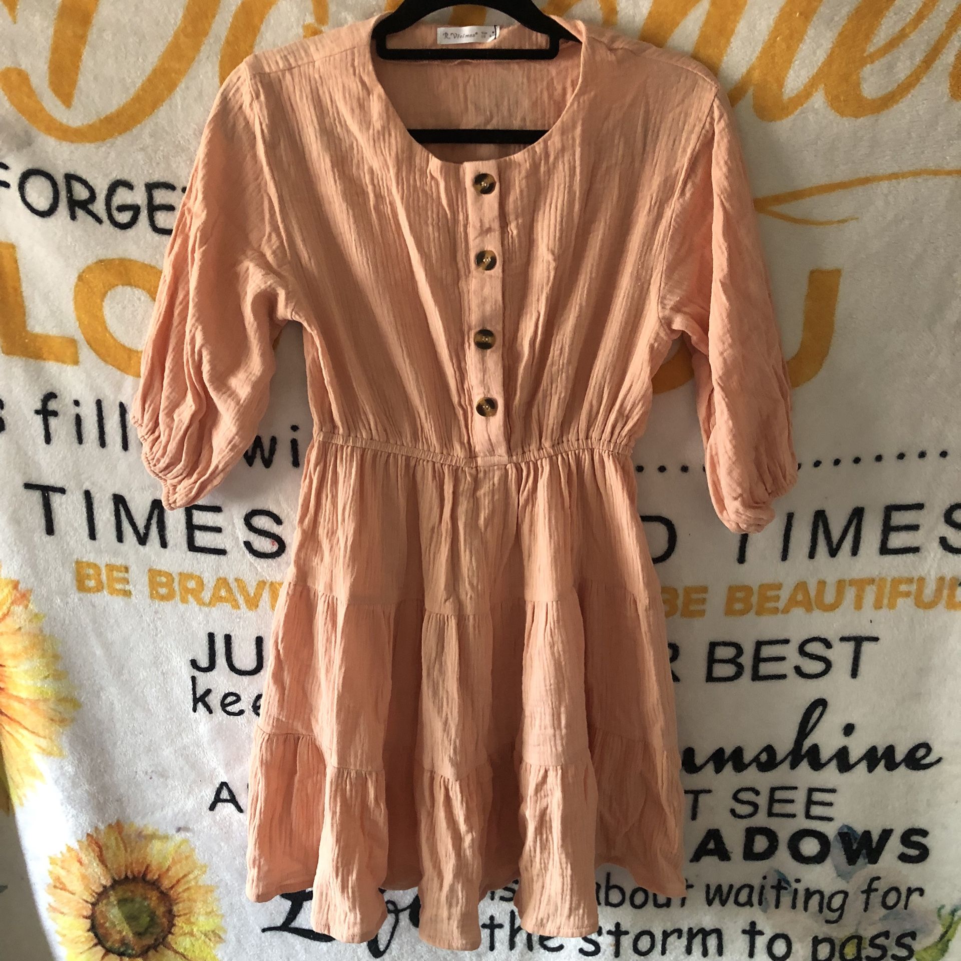 R. Vivimos casual button down front baby doll dress. Size M (8/10), short, casual dress. The sleeves measure about 14 inches long and are elastic cuffed at the bottom. Elastic mid that transitions into 3 tiers on the bottom. The elastic waist starts about 13.25 inches down from the top, and each tier below measures about 6 inches. Neckline top back to bottom measures about 31.5 inches. Pastel peach with 4 brown buttons on the top front. New with tags.