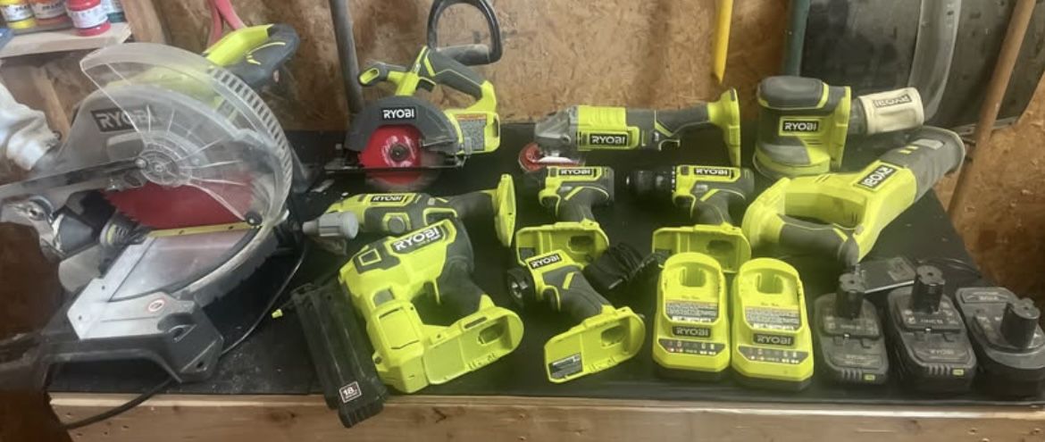 Miter saw Ts1346 10" upgraded with diablo blade fine finish with all original attachments - $140 6 tool set - impact, drill, multitool, flashlight, circular saw 5 1/2", reciprocating saw and 4.0 & 1.5 battery and charger with ryobi duffle bag with all orginal attachments - $155 Angle grinder 4 1/2" - $35 with original attachments Orbital sander 5" - $35 Brad nailer 18G one+ - $100 comes with leftover dewalt 1 1/4 nails Extra charger and 4.0 battery - $40