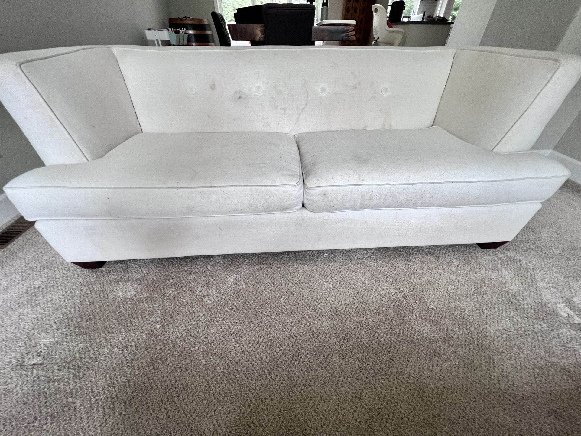 Great shape just needs to be cleaned. Structure is perfect and cushions are firm. Couch just needs a good cleaning. Non smoking home and pets never allowed on couch. Need gone make offers. Please no low balls as this was bought for 1300 from Bassett.