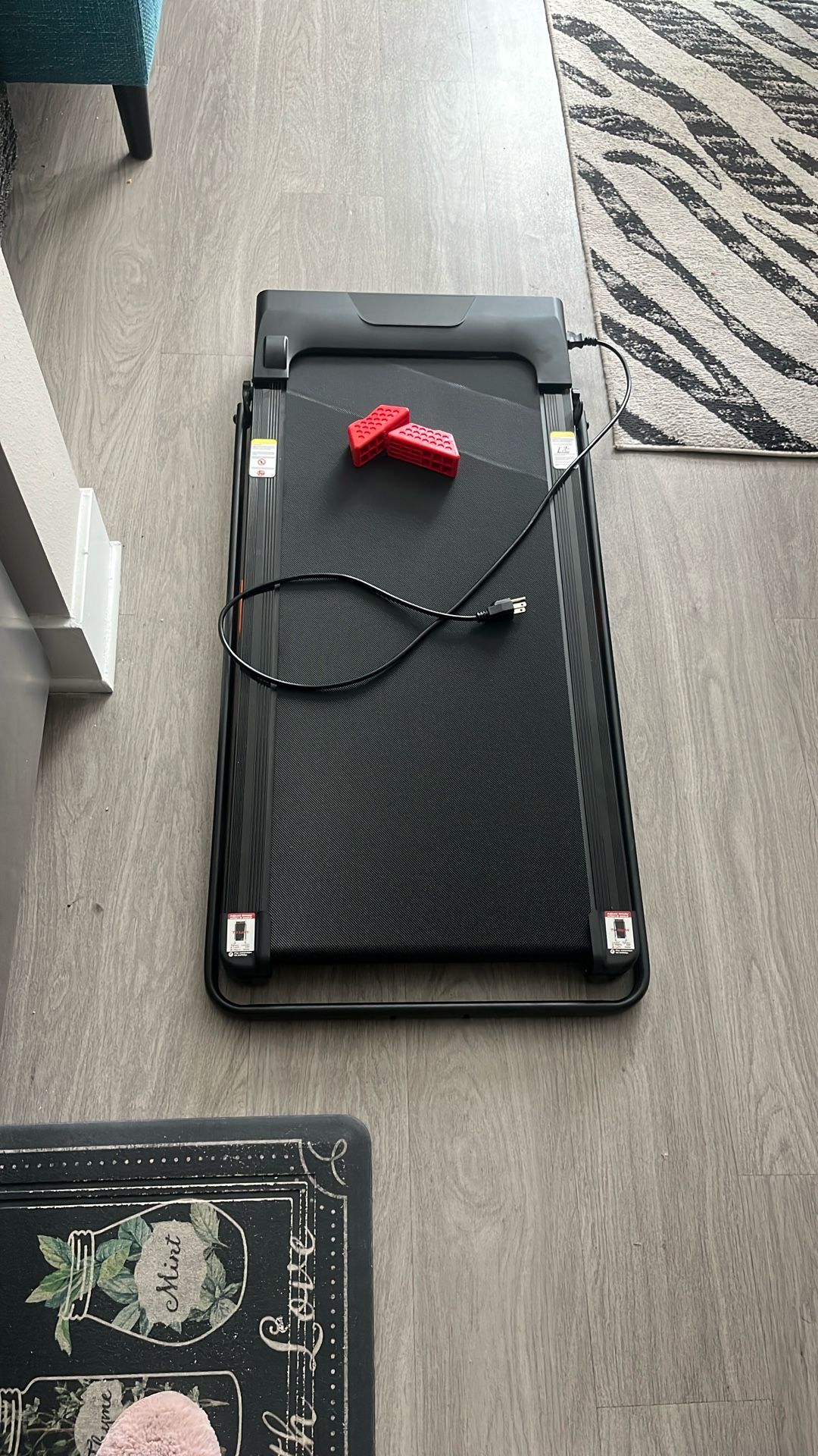 Includes red foot pedals, tray, instruction booklet, remote, and stability bar (folded down in pictures).