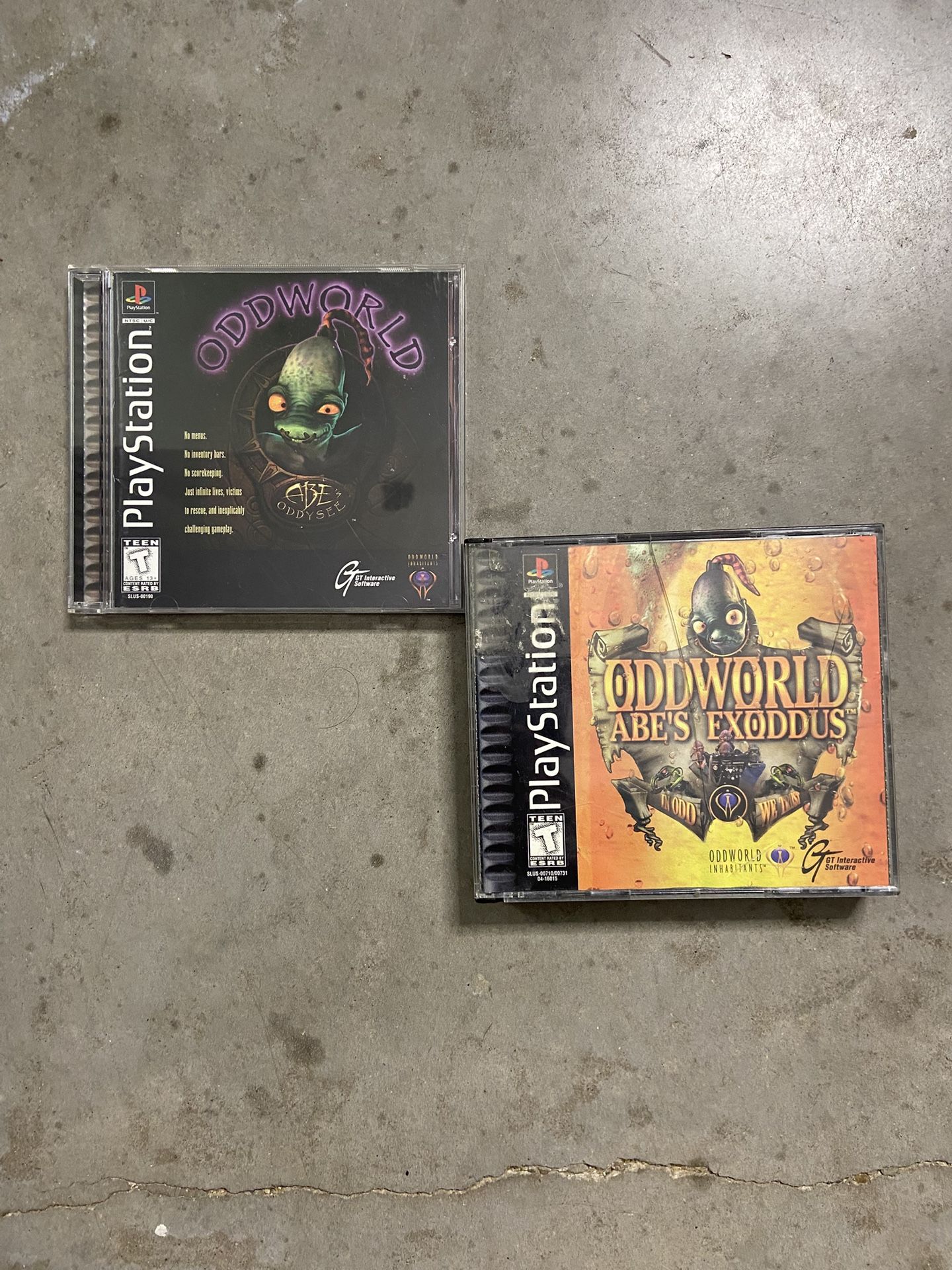 Oddworld Abe’s Odyssey & Oddworld Abe’s Exodus for ps1. Odyssey is in perfect condition and exodus has a few small cracks on the jewel case and no manual. Both have black PlayStation label.