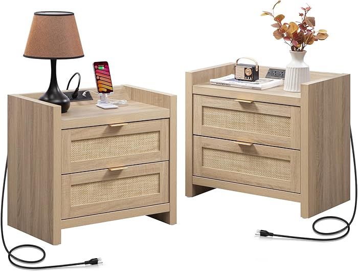 Rattan Nightstands Set of 2 Bedside Table - Bedroom Night Stand with Type-C Charging Station, 2 Drawers Storage - Boho Night Stands End Table for Bedr