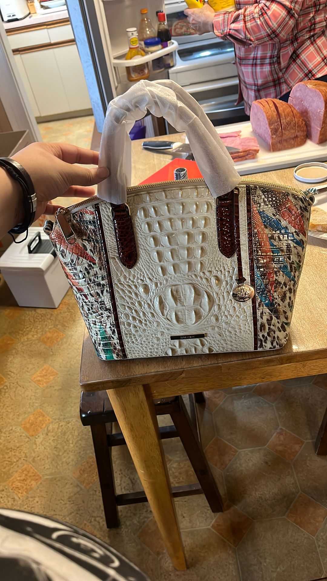 A leather Brahmin bag, never used, tags still on. missing the small bag that comes with it, has registration card, storage bag, and cross-body strap.