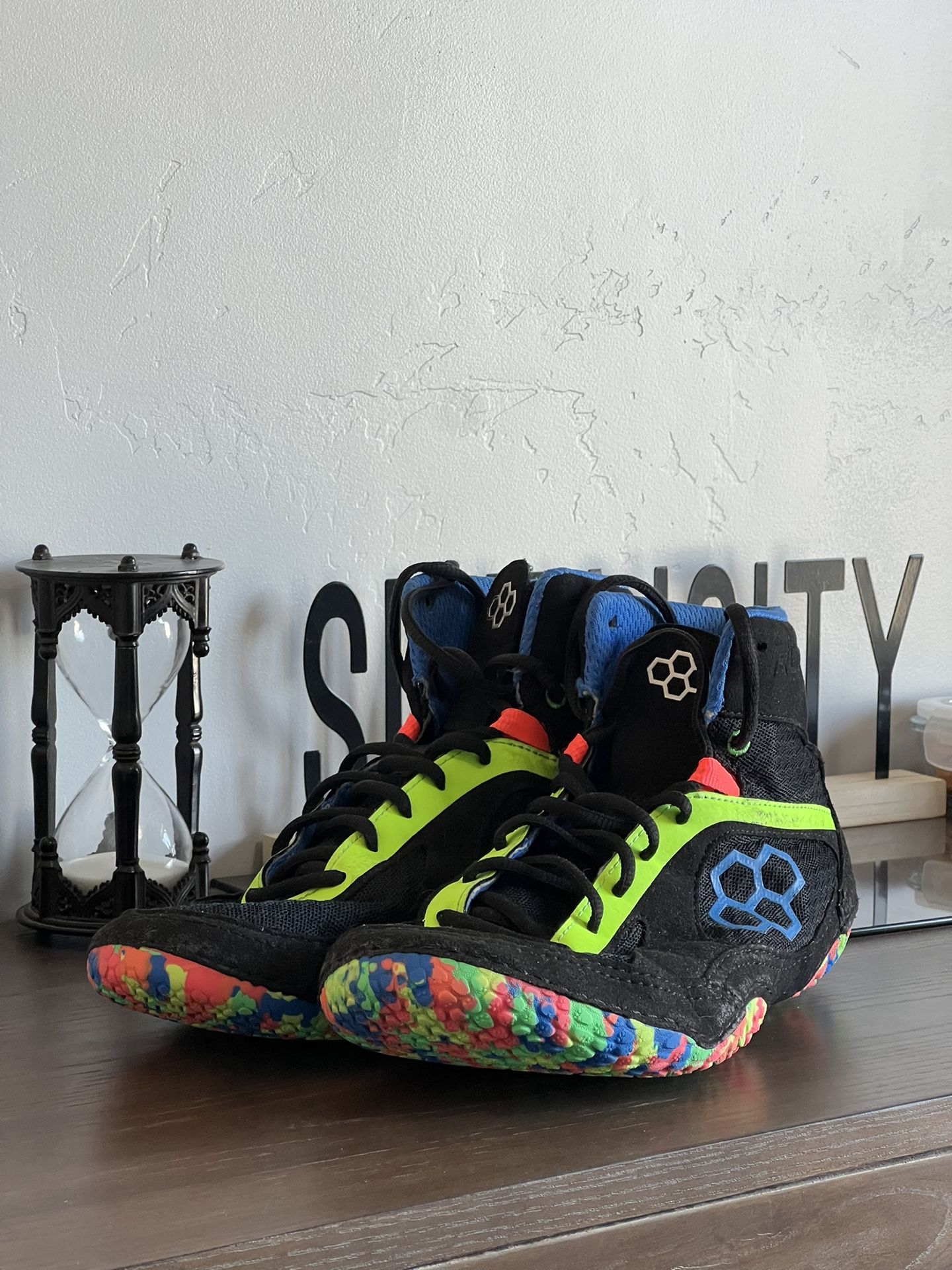 Bought them for my senior year then never used them again! Only used it for practices and a few duals and tournaments. What I’m trying to say is that it’s in spotless conditions and would be great for you on the Matt! Size men 10.5 (USA)