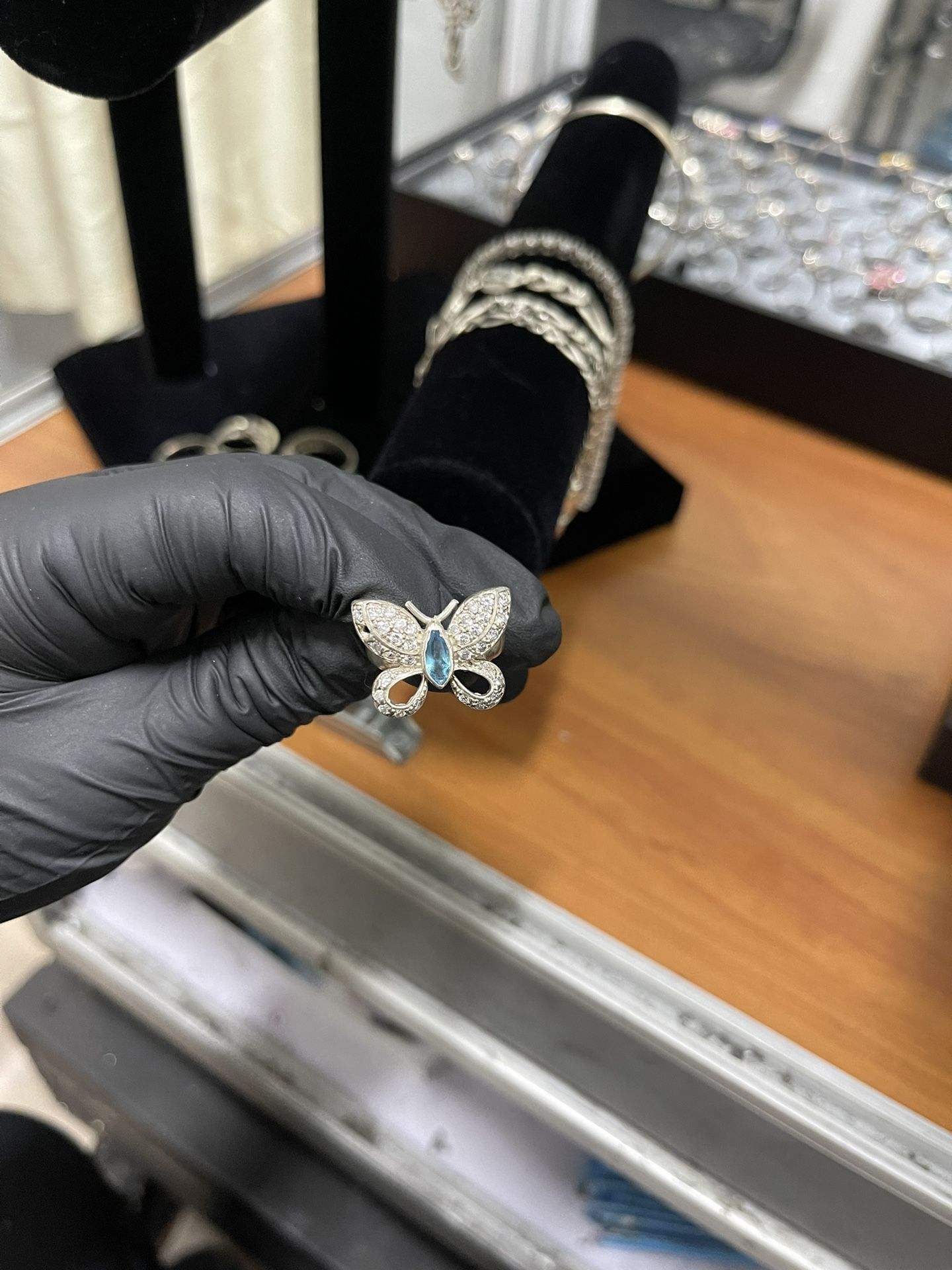 Silver butterfly ring $40 Marihuana Silver ring with diamond cut inside $25.00 Silver Ring with a single stone and with stones around $30.00 Snake silver ring with a teardrop-style stone month March $35.00 Marquise silver ring with two baguette sets $38.00