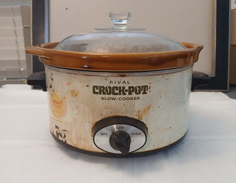 Vintage Rival 5qt. Stoneware Crock Pot Slow Cooker WORKS GREAT!! 5qt. Stoneware Ceramic insert is in excellent condition. Glass lid has clouding but fits perfectly. Base/ Heating Element has sporadic rusting externally but works perfectly. Unit is clean overall. Pre-owned and selling from an estate. No restoration efforts have been made, however, the rust spots and cloudy lid are an easy fix if interested in cosmetic correcting. All wear is consistent with age and use and is strictly cosmetic. The slow cooker is fully-functional. 5-quart Stoneware ceramic insert is in great condition. Available immediately in North Sacramento (95842).
