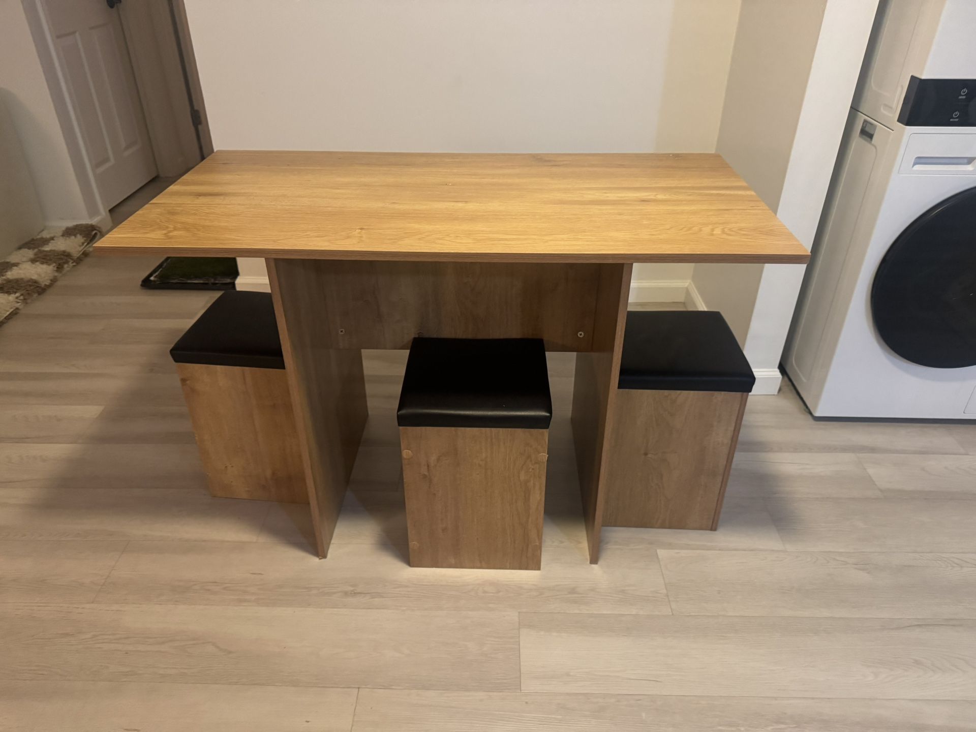 Comes with 8 stools that all open from the top with deep storage. I’m moving at the end of the month and will no longer need the table