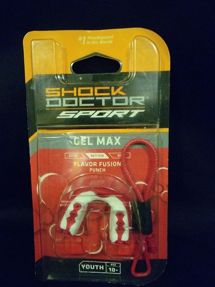 Shock Doctor Sport Gel Max Flavor Fusion mouthguard Condition: Pre-Owned-New in Original Packaging Model: Gel Max Flavor Fusion Punch Age: Youth 10- Features • Gel-Fit liner that custom molds to the user's teeth for a comfortable and secure fit • Provides essential protection for the teeth and jaw during contact sports like football, basketball, and MMA. • Has a triple-layer design with an integrated breathing channel. • Includes a convertible quick-release tether for the option of strapped or strapless use. • The specific product in the image is a "Youth" size, recommended for ages 10 and under.