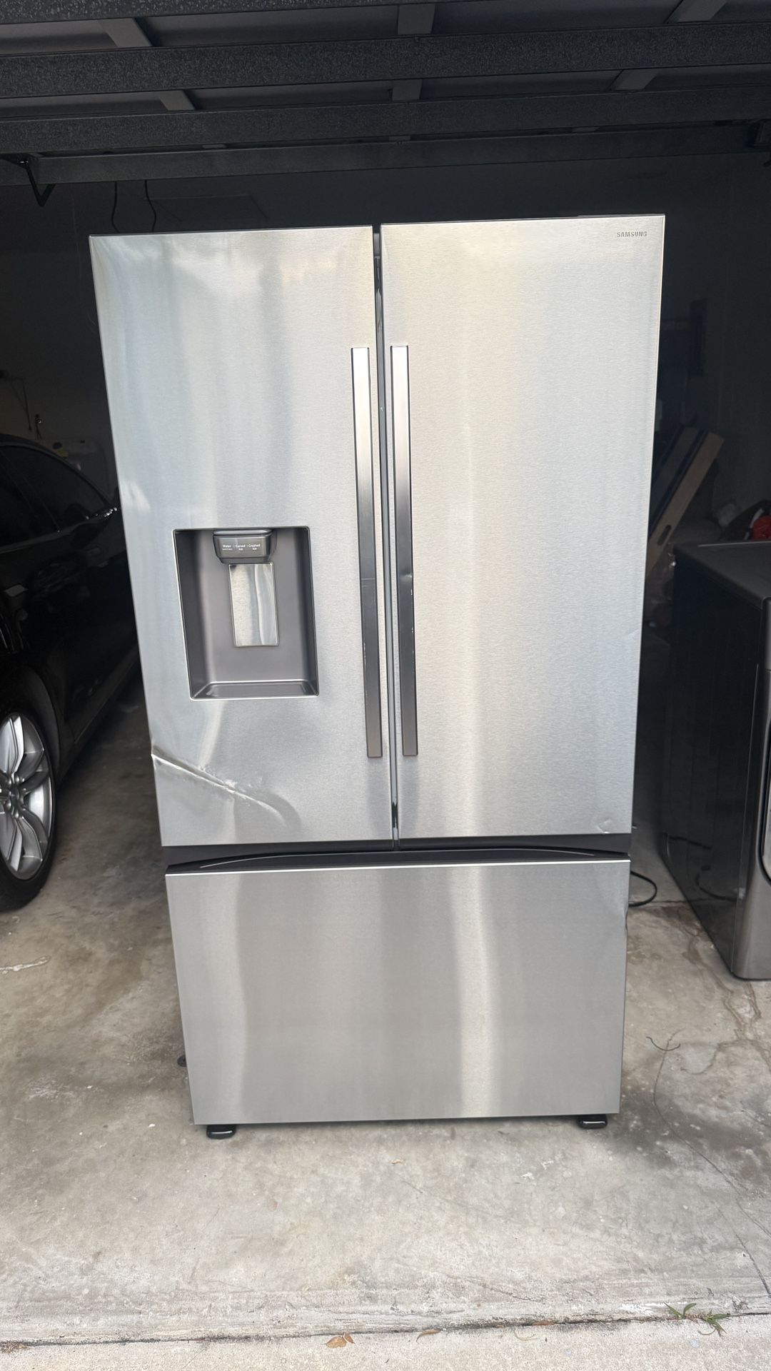 Samsung French Door refrigerator, 2025 model, in great working condition. Fully tested — cools and freezes perfectly. Has some minor cosmetic dents (shown clearly in photos), but functions like new. Clean inside, bright LED lighting, metal cooling panel, ice maker, and filtered water dispenser. Comes with a 3-month warranty. Payment Accepted: Credit/Debit Cards, Checks, Apple Pay, Cash, Zelle, Venmo, Cash App.