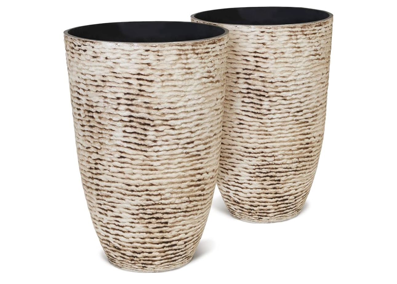 Worth 9 Gallon Tall Round Planters Set of 2-14" Dia x 21" H Stone Finish Flower Pots Indoor Decorative Container Garden Patio Unbreakable Beige Classic Appearance: Its curved silhouette and raised details offer up a touch of classic character, while a solid matte finish with grain texture updates the look; These tall tree planter is an ideal for a patio accent or flanked along an entrance wall; Gives your tall plants a tall planter! Size:14'' (Dia.) x 20.5'' (H.) DIY Drainage Hole: These large Round planter don't have drainage holes; You can make the drain holes you want by yourself Weather Resistant: It doesn't mind UV light beaming down or rainstorms rolling through; Weather resistant allows It’s equally suited to spruce up an indoor and outdoor space