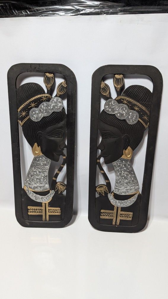 Pair of 20x7 Inch Hand Carved African Wall Art Panels Tribal Woman Silver Accents