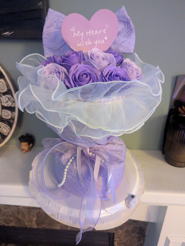 Purple artificial roses arrangement with bows and ribbons . Perfect for a birthday or a simple thank you gift.