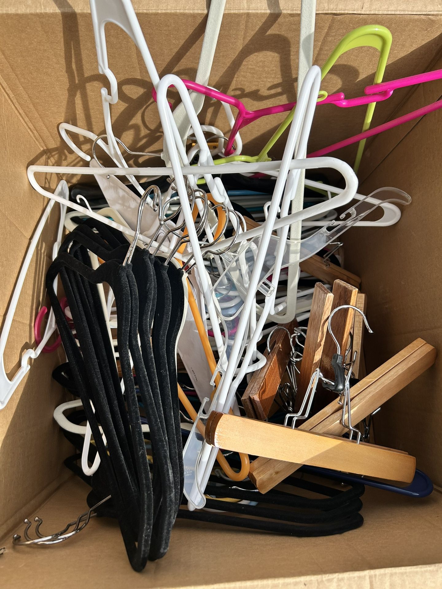 Box of hangers - includes wooden clip hangers and velvet hangers
